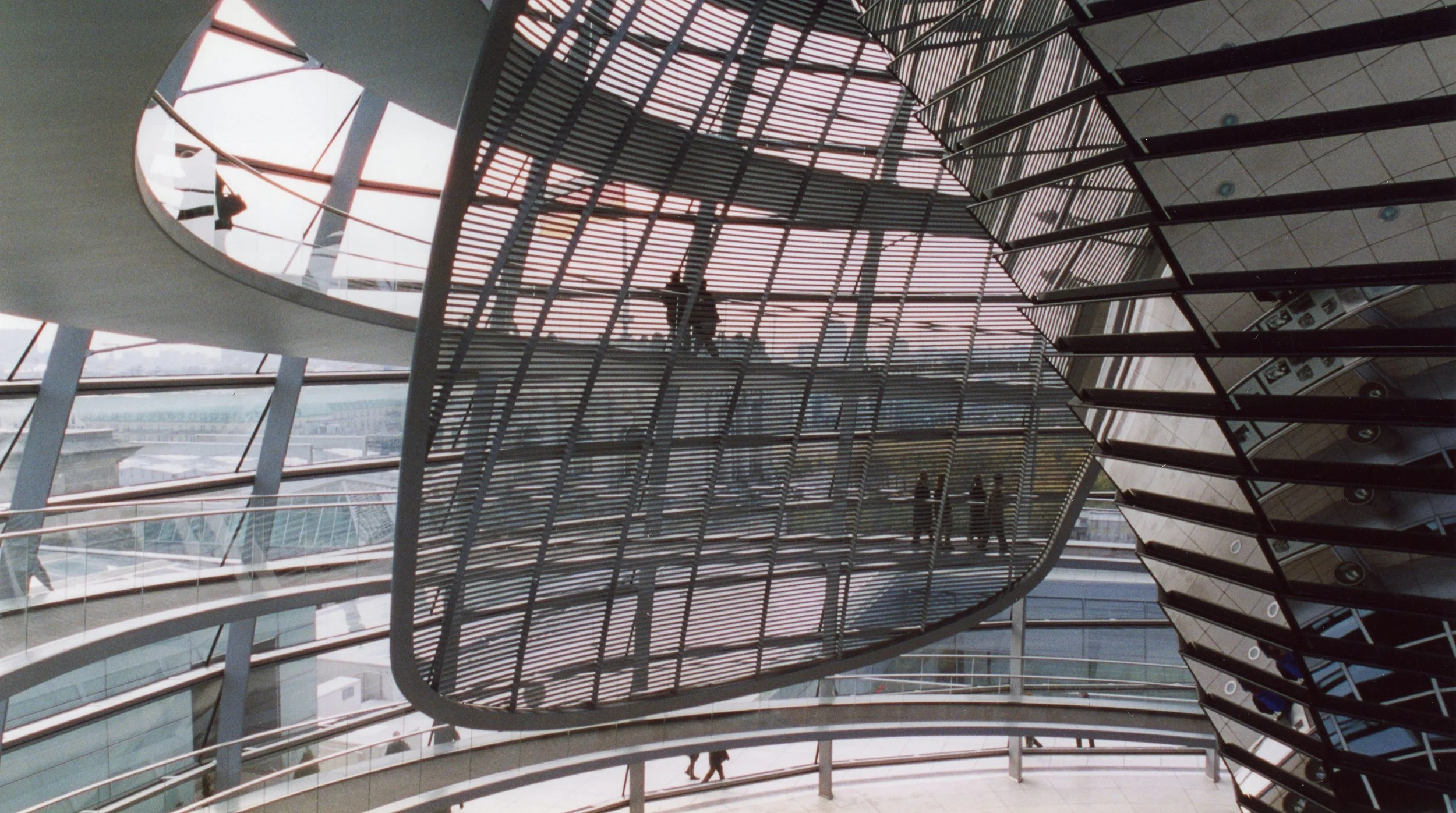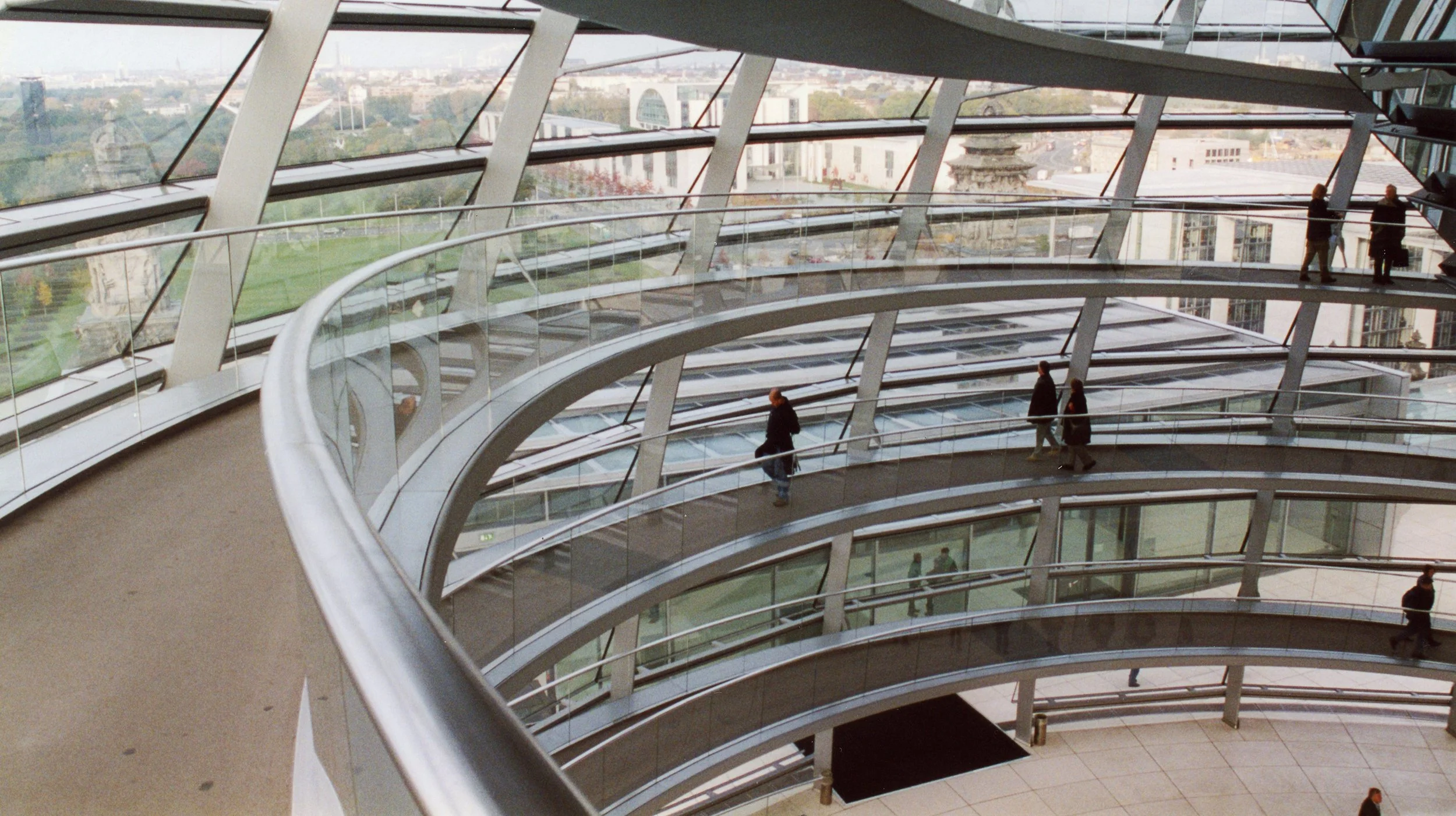 To enter the dome, you walk across the edges of the Tiergarten, get in line and wait. After a lengthy and thorough security process, you ascend in a glass elevator to a roof where you suddenly find yourself outside. From there the dome and its glass and mirrors and ramps are only a few fateful steps away.