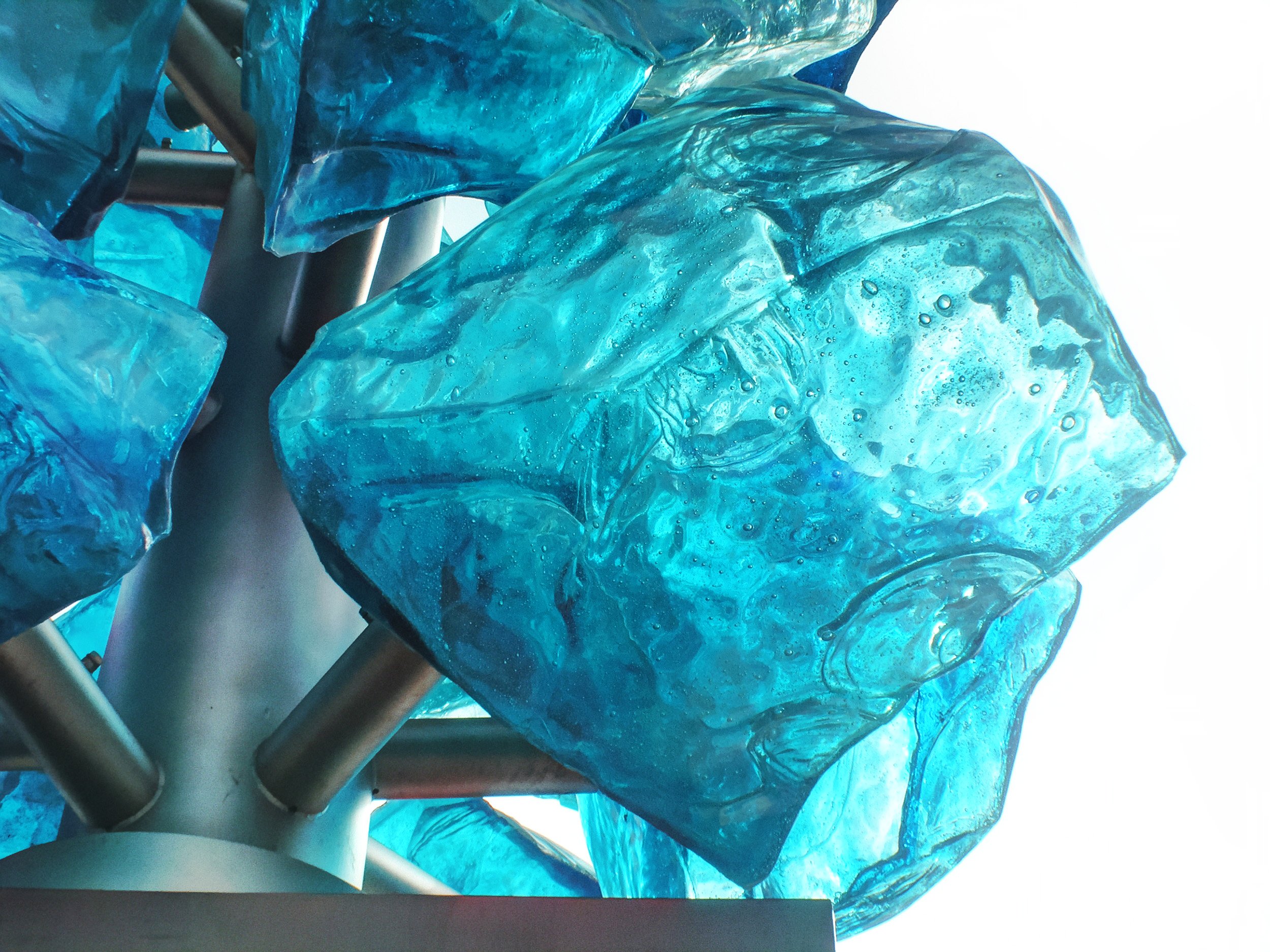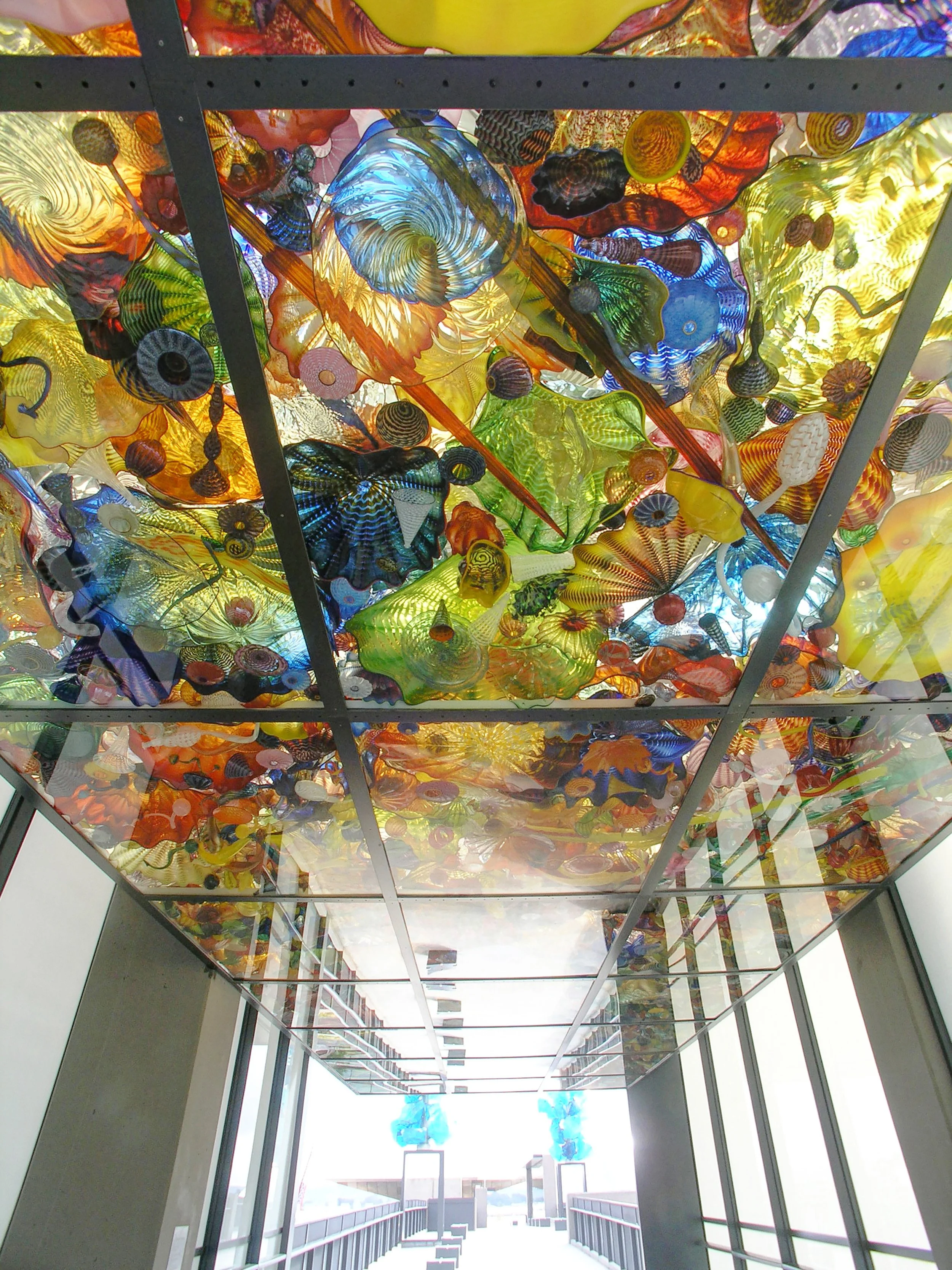 Dale Chihuly is not represented inside the small galleries at the Museum of Glass but instead has produced a large installation on the Bridge of Glass, a wide, solid concrete bridge over the freeway and railroad tracks. The Chihuly parts are limited to two pavilions and two large blue ice cube towers. One of the pavilions contains individual vases and the other (pictured below) contains a ceiling of scattered stained glass pieces. If you're a fan of Chihuly and need to see more let me know, although admittedly if you're already familiar with his work then there's a damn good chance that you'll already be familiar with this.
