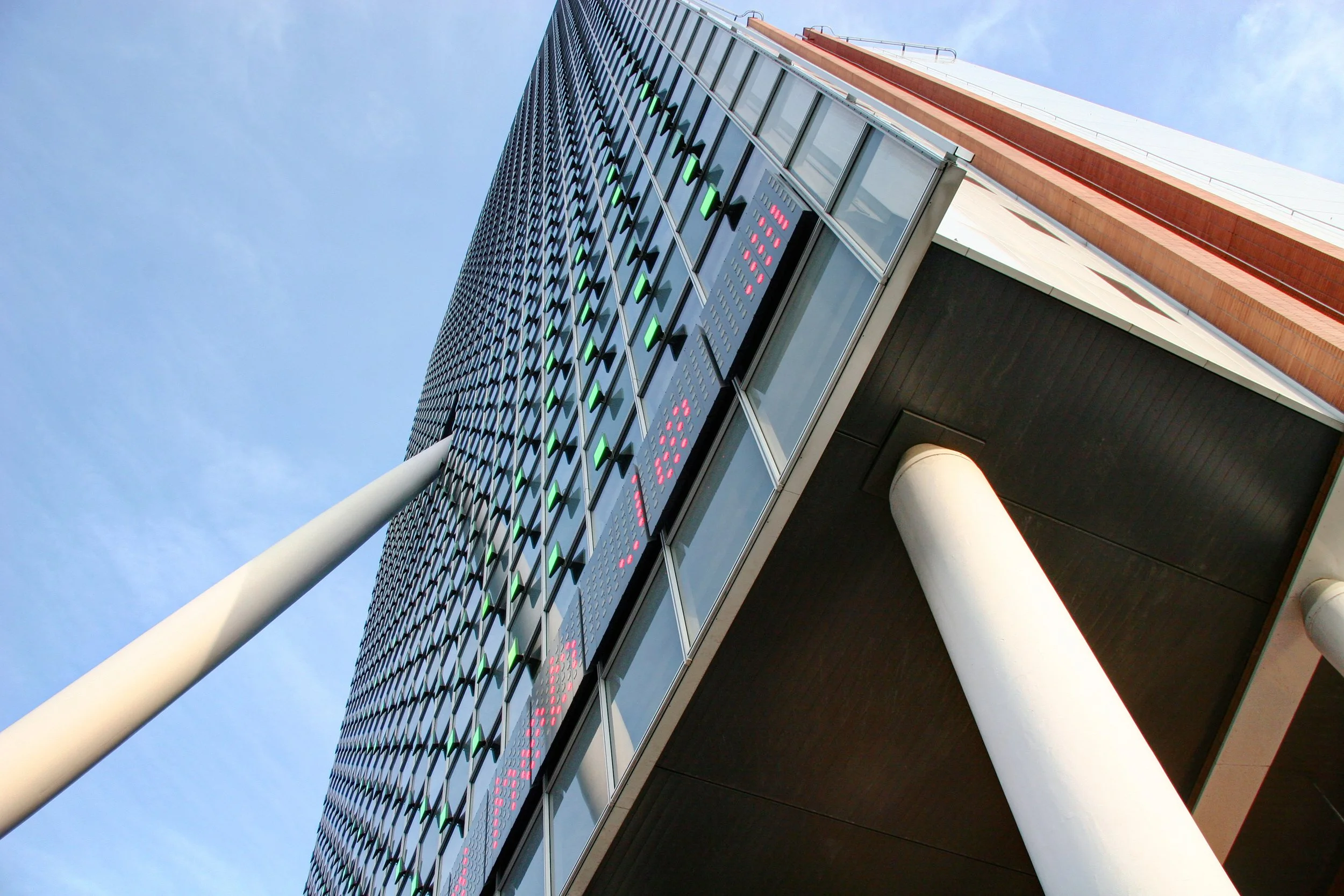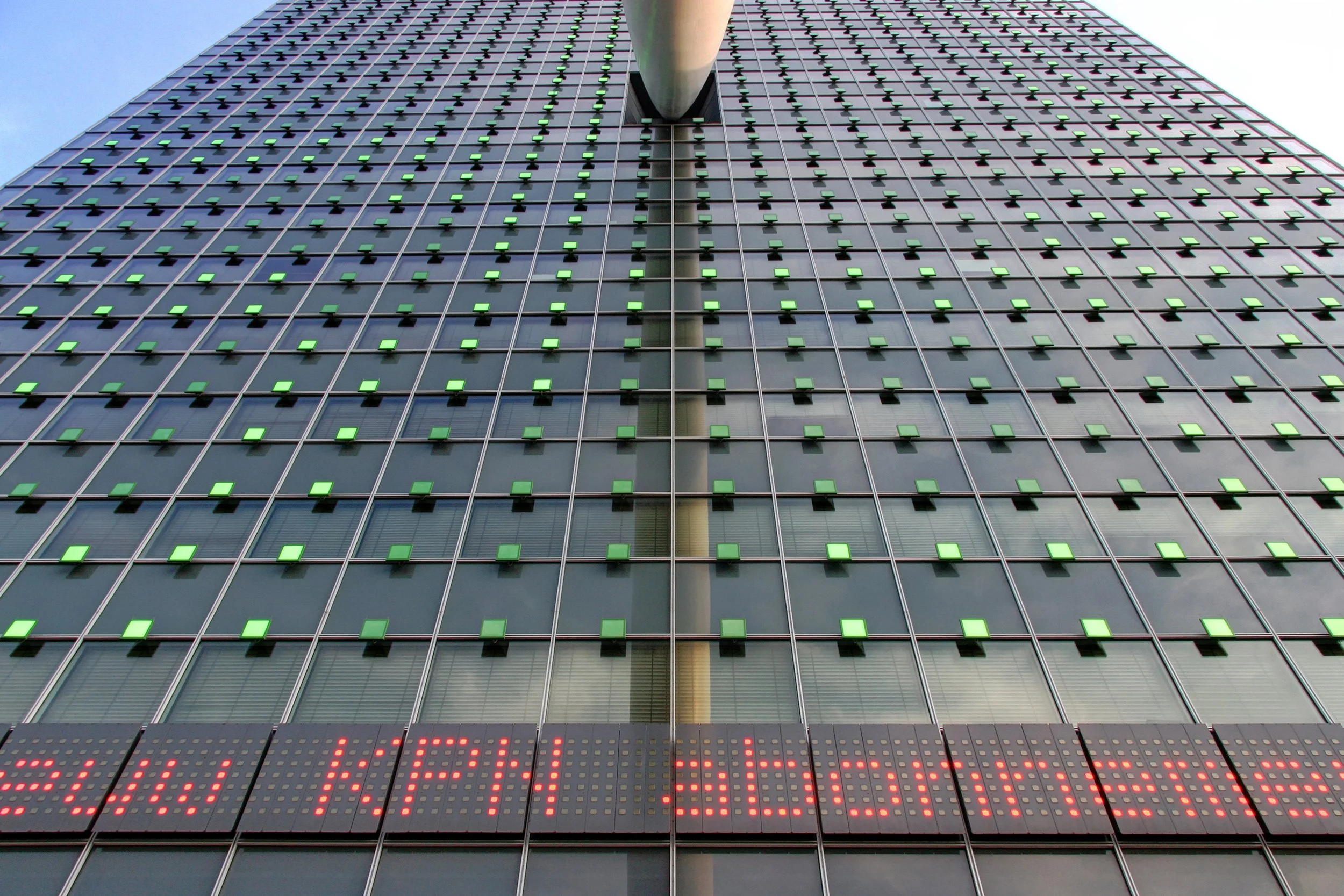 At the far end of the Erasmus Bridge, Renzo Piano's striking KPN Telecom Building does just about everything it can to steal your attention. There's the scrolling text of headlines at the base and the little green squares that turn on and off and appear (from a distance) in various legible patterns, a rotating globe, giant text, that kind of thing. All that plus the fact that the entire facade is tilting forward and appears only to be held back by the one, central support- see the first picture this page for a slightly less confusing, um, I mean artistic view.