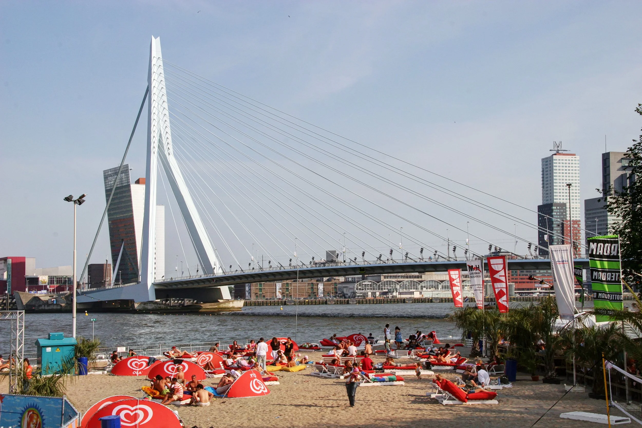 The Erasmus Bridge memorably crosses the Nieuwe Maas (really the very end of the Rhine River) with a cable stayed bridge (on the right) and a bascule draw bridge (on the left). While I took a lot of better pictures of the bridge, this one manages to reference a few of the other images below- on the far right is a tower by Mecanoo and on the far left is a tower by Renzo Piano, both of which you will soon see. As for the beach, it was Rotterdam's contribution to an overall trend of temporary summer spaces in landlocked cities across Europe, a chance to get away without any of the trouble.