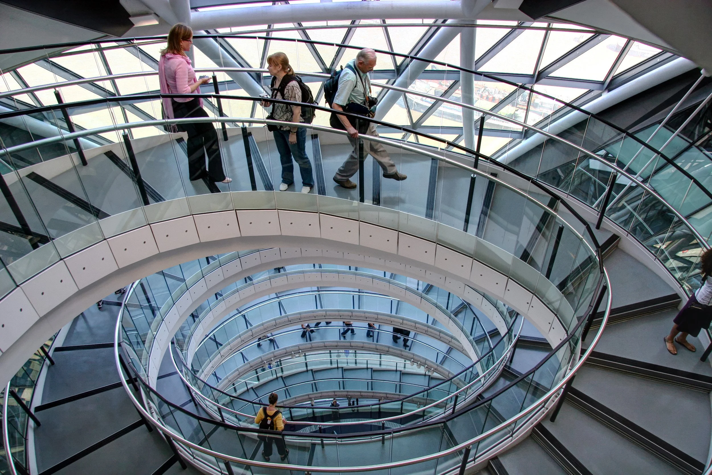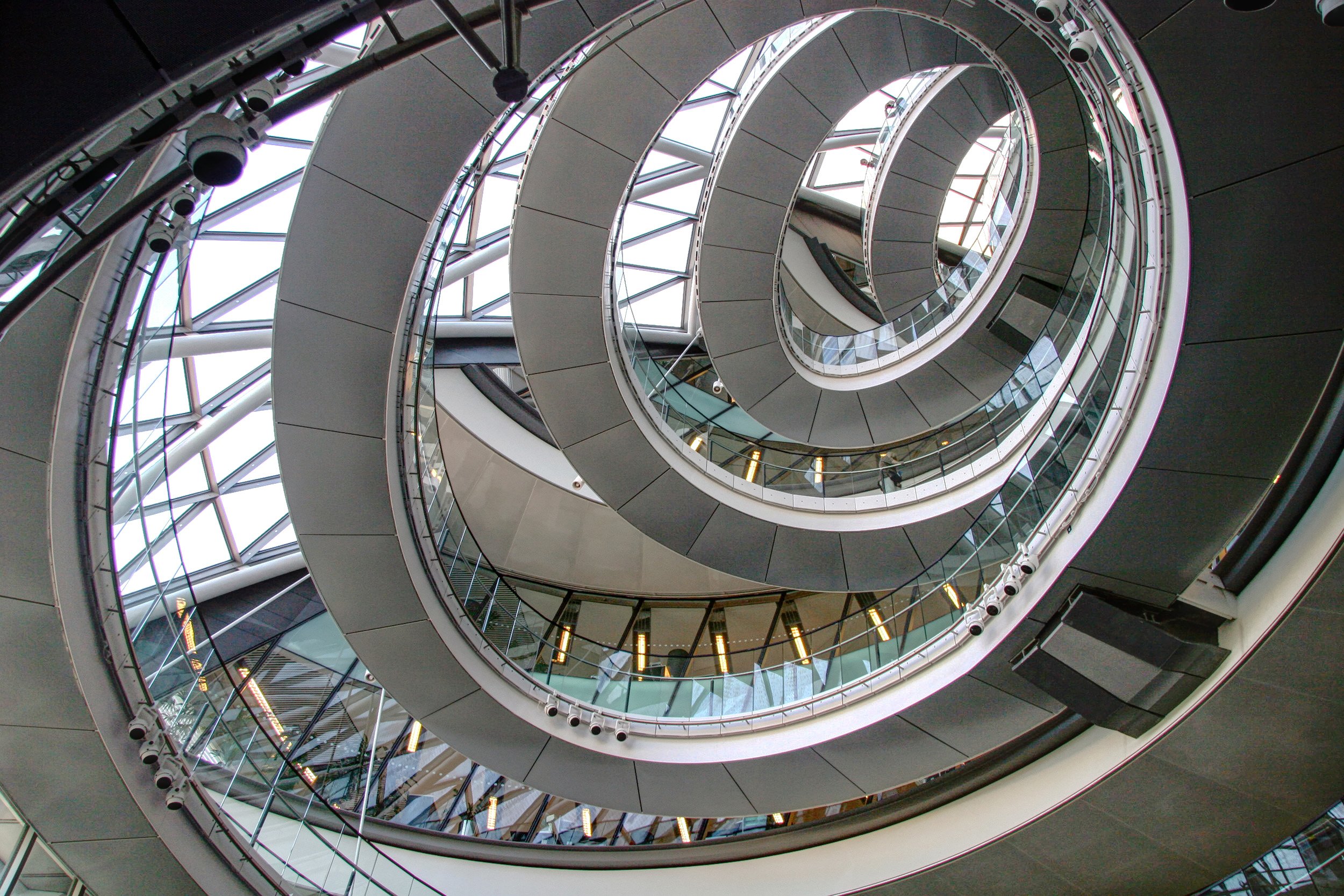The stairs connect the top floor (featuring a public space and balcony) to its first floor (featuring the city's council chamber). In between are floor after floor of office space and (of course) that show off staircase which seems to somehow pose again at every turn, at every angle.
