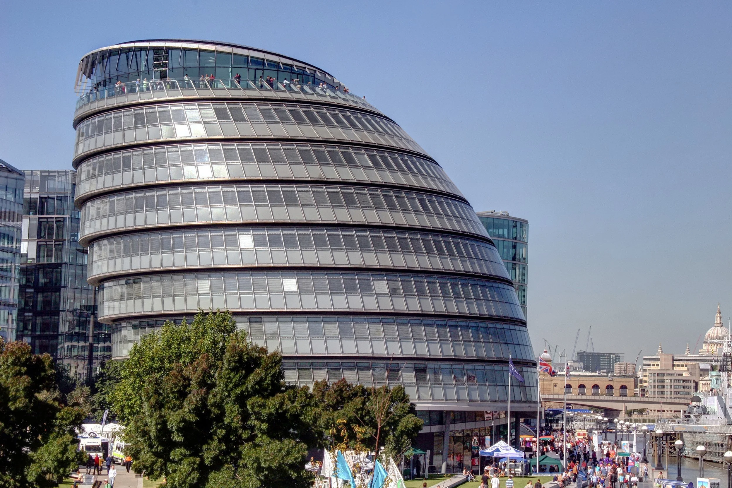 A smattering of Open House London visitors hang out on the top floor balcony of the funny, tilting egg massing that is City Hall as seen from Tower Bridge (extra points if you can find St Paul's). City Hall is part of a larger Norman Foster designed development, one that includes a series of office building and holds the unfortunate developer given name of "More London."