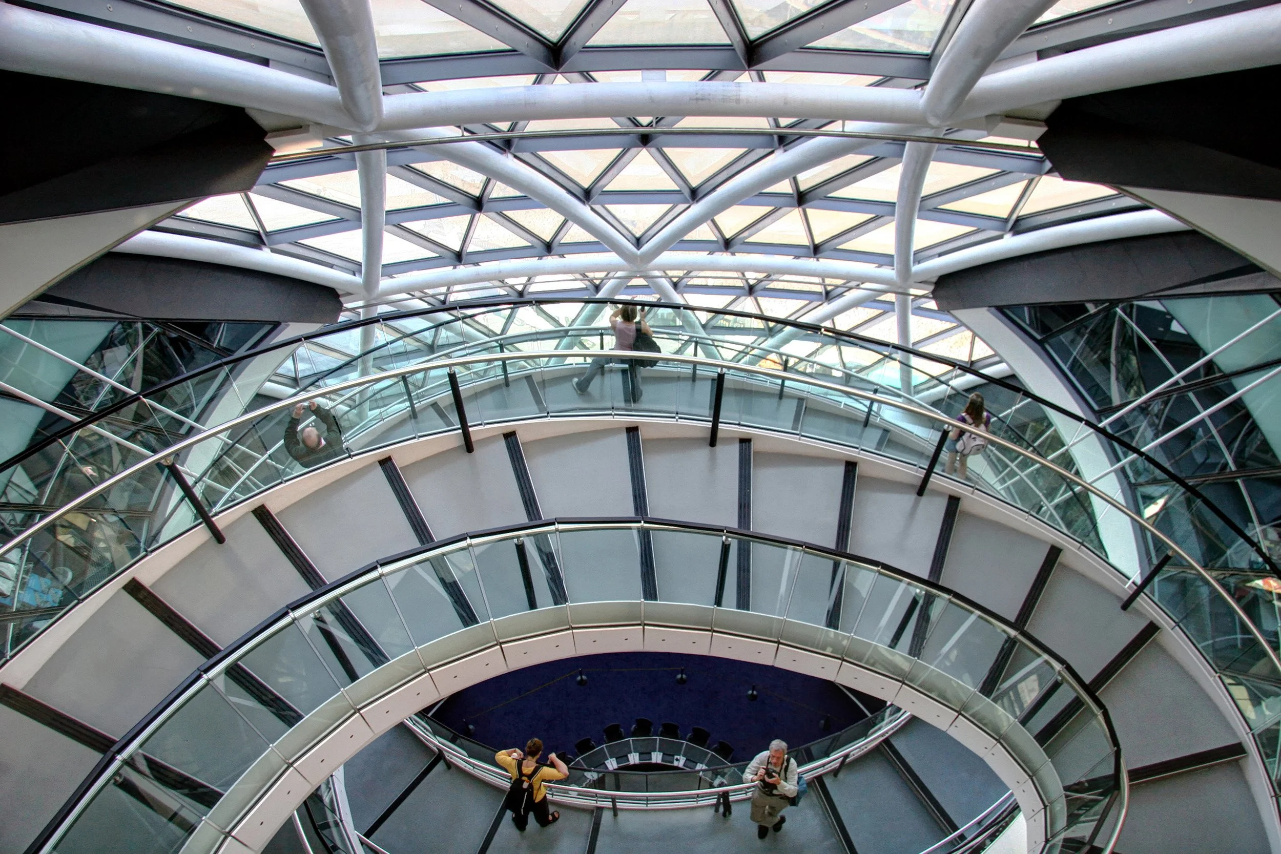 One of the stars of the annual Open House London weekend and a building that is way more fun than the photographs (if you can believe it) is Lord Norman Foster's London City Hall. Sitting on the south bank of the Thames directly across the river from the Tower, the building houses all the important city offices that one time took up all of London County Hall. The centerpiece of the building isn't its funny, tilting egg massing or admirable sustainable features but rather its mostly unnecessary but super, non stop fun staircase. Pushed out in the front of the building, the stairs are loop after loop after loop of unbelievable reflections, killer views and fantastic photo opportunities.