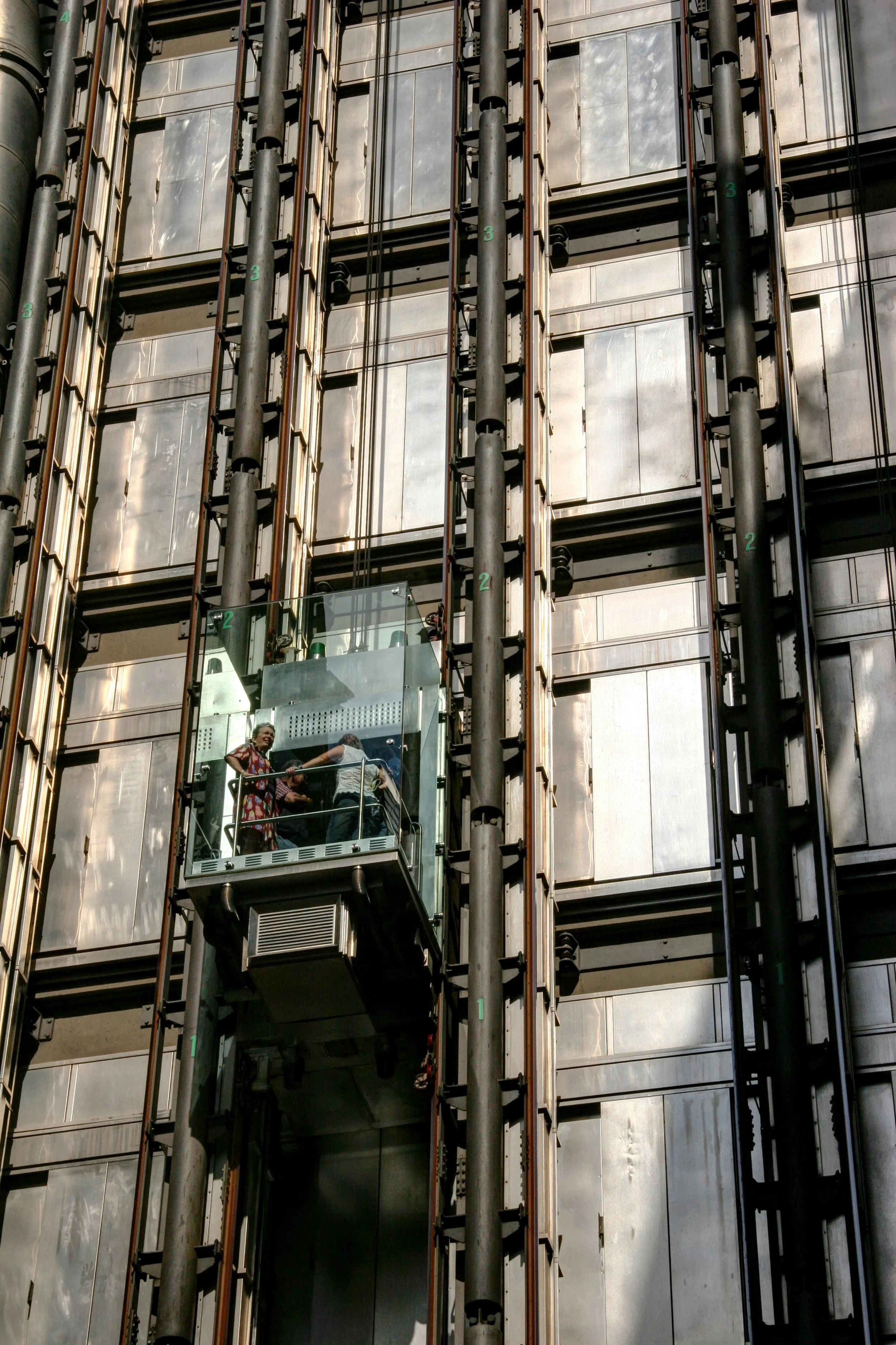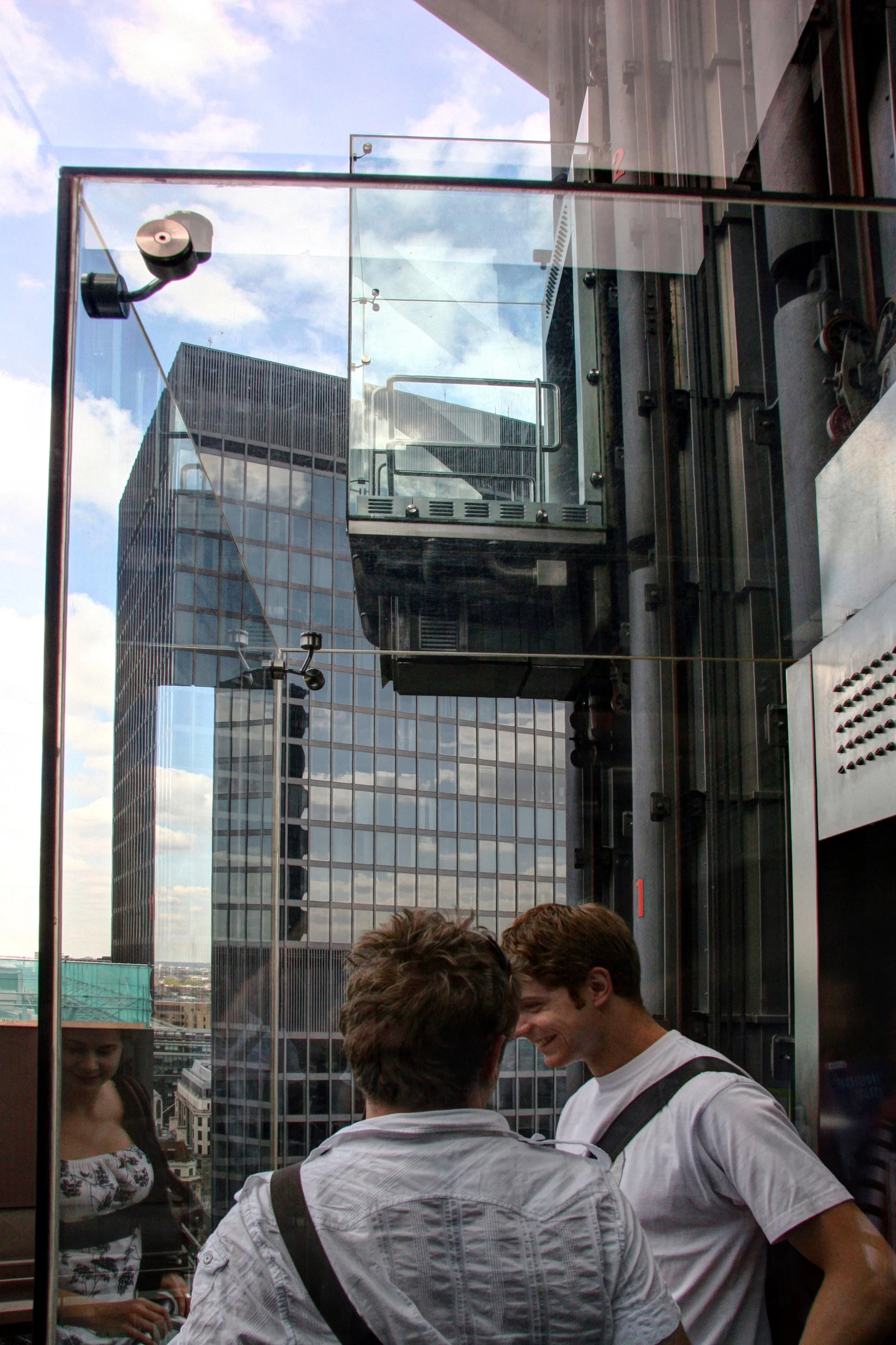 From inside an elevator cab, looking through to a second cab and then into a third, this starts to show how fun the elevators are. The building is not especially tall but feels like it is, making the elevator ride even quicker and more dramatic then something (like the CN Tower in Toronto) that goes on and on and up and up. It's as close as you can come to flying exactly vertically up or down a building with a bunch of strangers with British accents and still survive.
