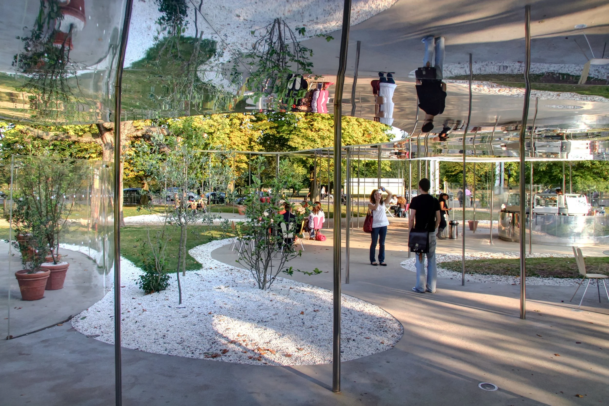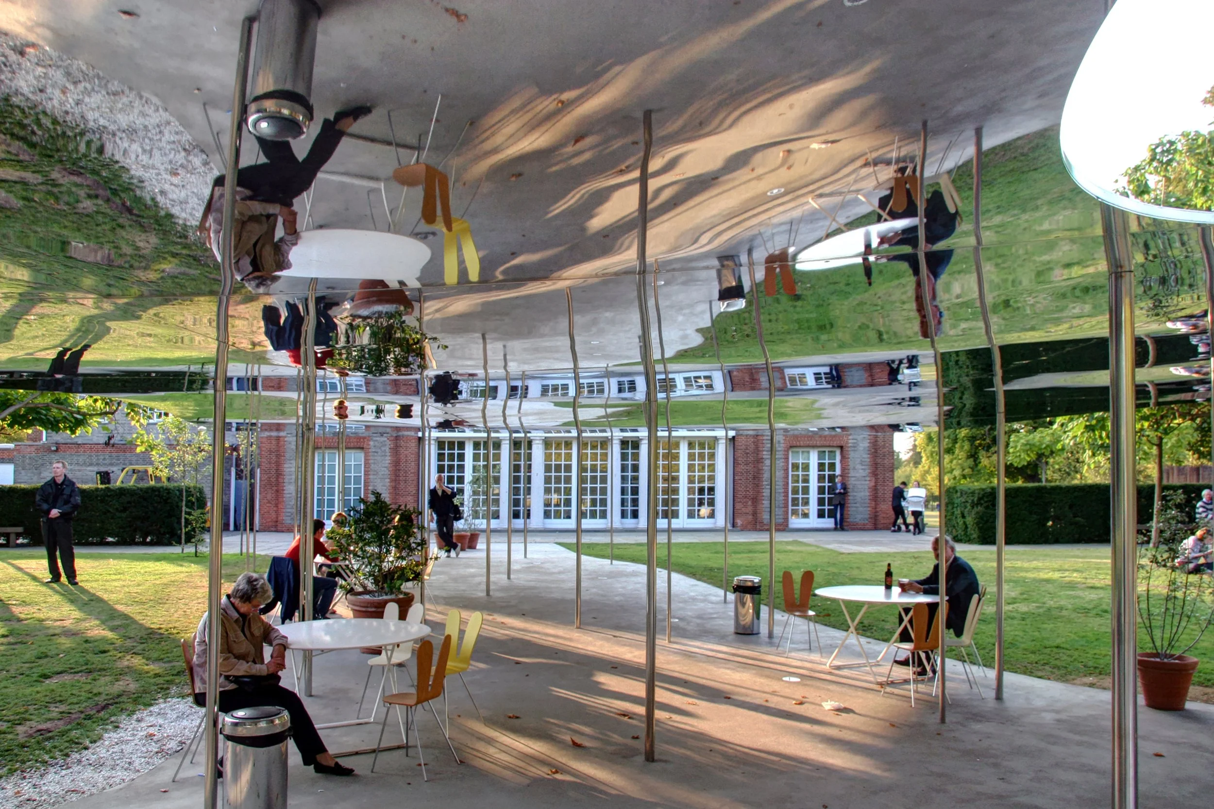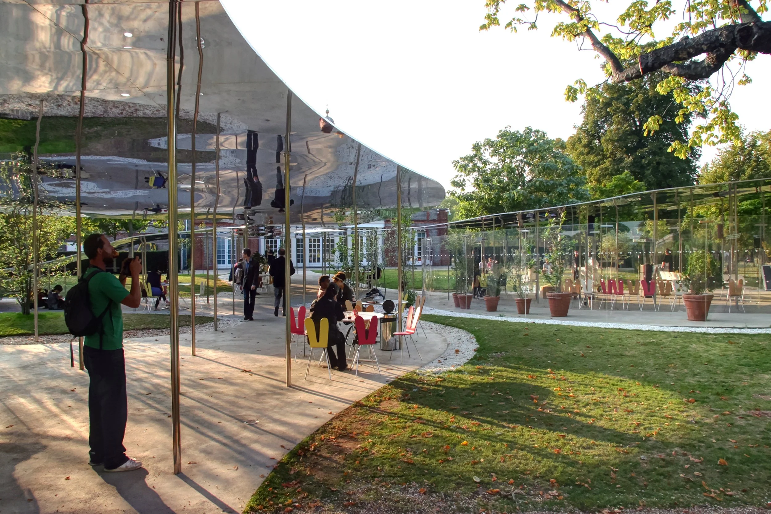 The architecture continues at SANAA's wonderful temporary pavilion out in front of the Serpentine Gallery in Hyde Park (or possibly Kensington Gardens, it's hard to tell where the border between the two really is). Every year the Serpentine Gallery commissions an architect who has yet to build in England to design a temporary folly out in front of their suspiciously small gallery. SANAA's answer was a crowd pleasing floating mirrored plane, one that is fun to visit, fun to see and even more fun to photograph.