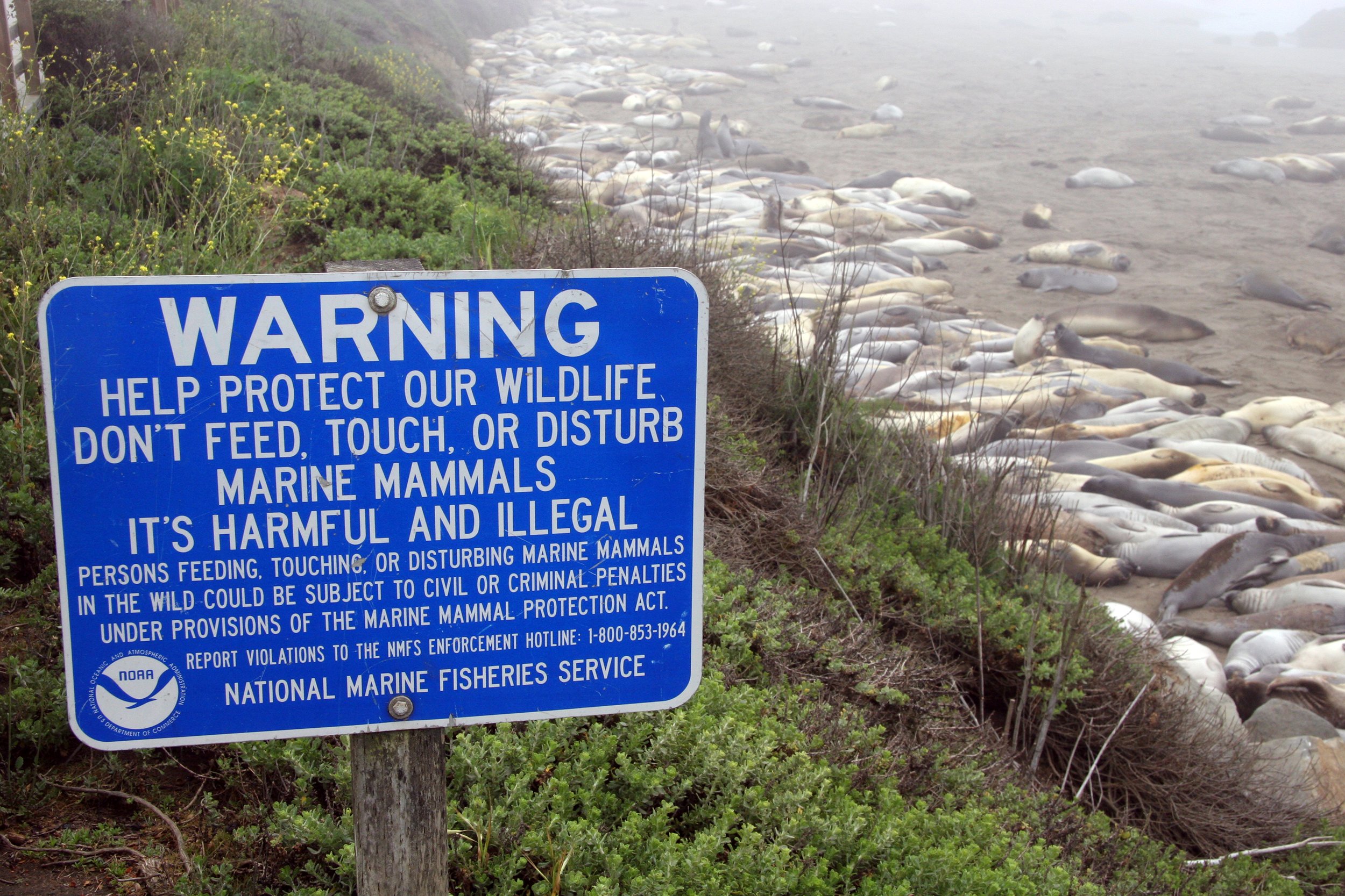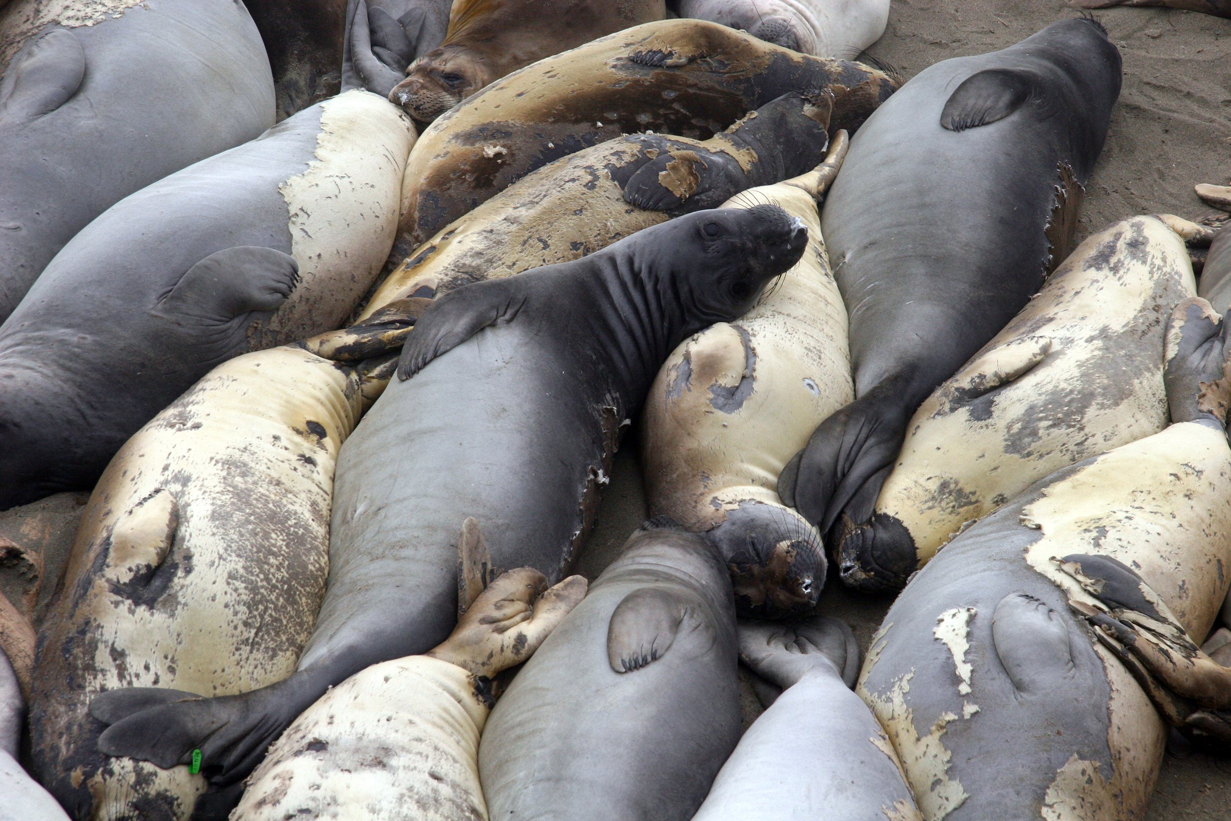 Not only is that section of Route 1 insanely beautiful (even on an on again off again foggy morning), it is also teeming with wildlife. This is the Piedras Blancas (White Stones) Elephant Seal Rookery, where an ample parking lot and a well warned boardwalk leads to overlook after overlook of a hell of a lot of seals, a fascinating real life rookery almost close enough to touch (although touching the seals would of course be harmful and illegal). And on an early, foggy Sunday morning in early May, the seals took the opportunity to sleep in, to lie on the beach, to occasionally throw sand on themselves and (most importantly) to stink to high heaven. Words can not quite describe exactly what a real life rookery smells like. Take it from me.