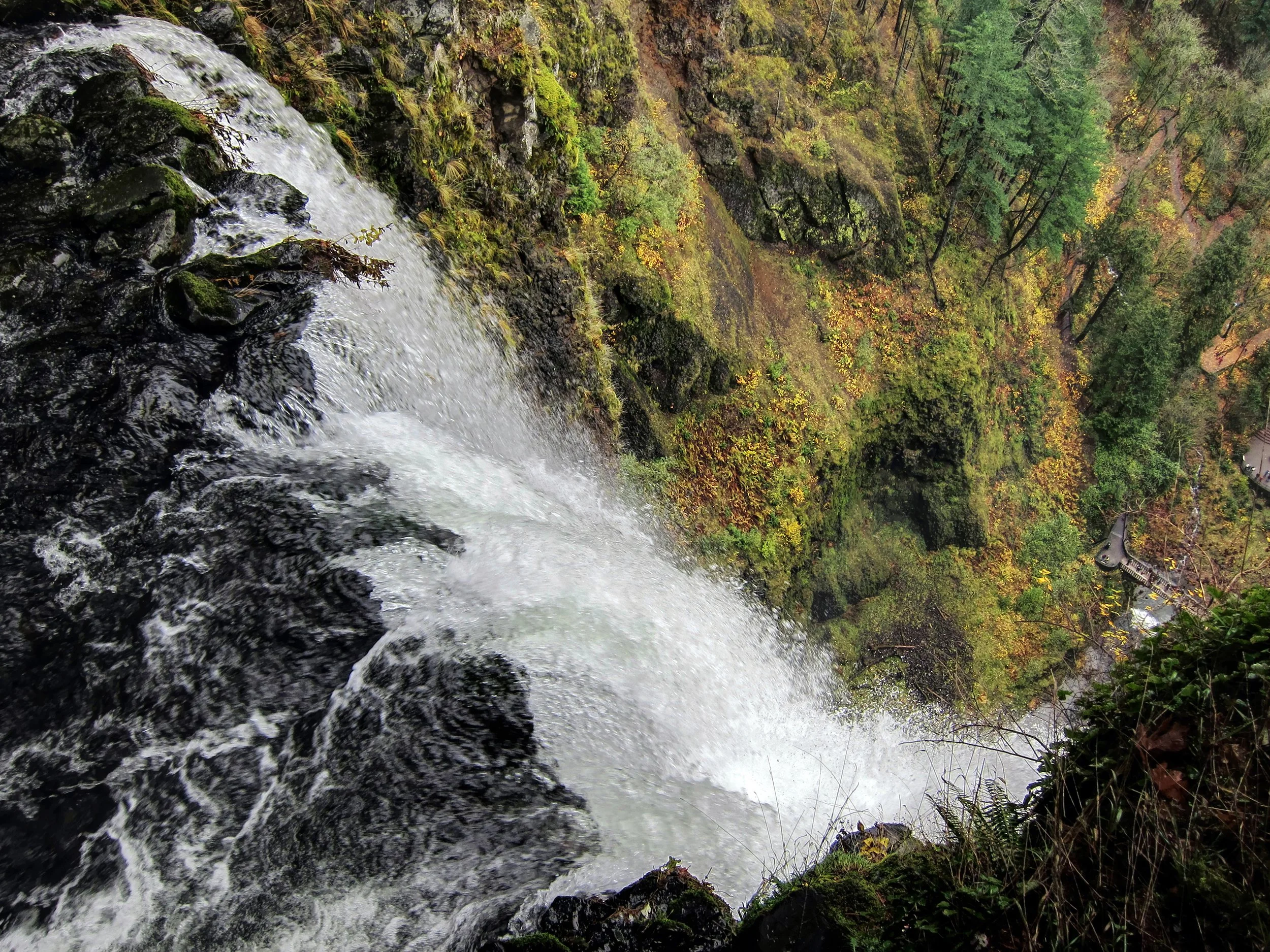 We’ll start all this madness with a great way to start off a slideshow, at least in my opinion. This is Multnomah Falls, a 600 foot drop of water on the south side of the Columbia River Gorge, about a half hour west of downtown Portland. The falls is both a terrific roadside attraction (on a route with many such terrific roadside attractions) and, more importantly, a great place to get out of the car and climb the trail all 600 feet to the top. All along the trail there are gaps between the towering pine trees that afford views into the gorge or up at the falls or, at the very top, a view straight down the falls to see all that you just climbed up.