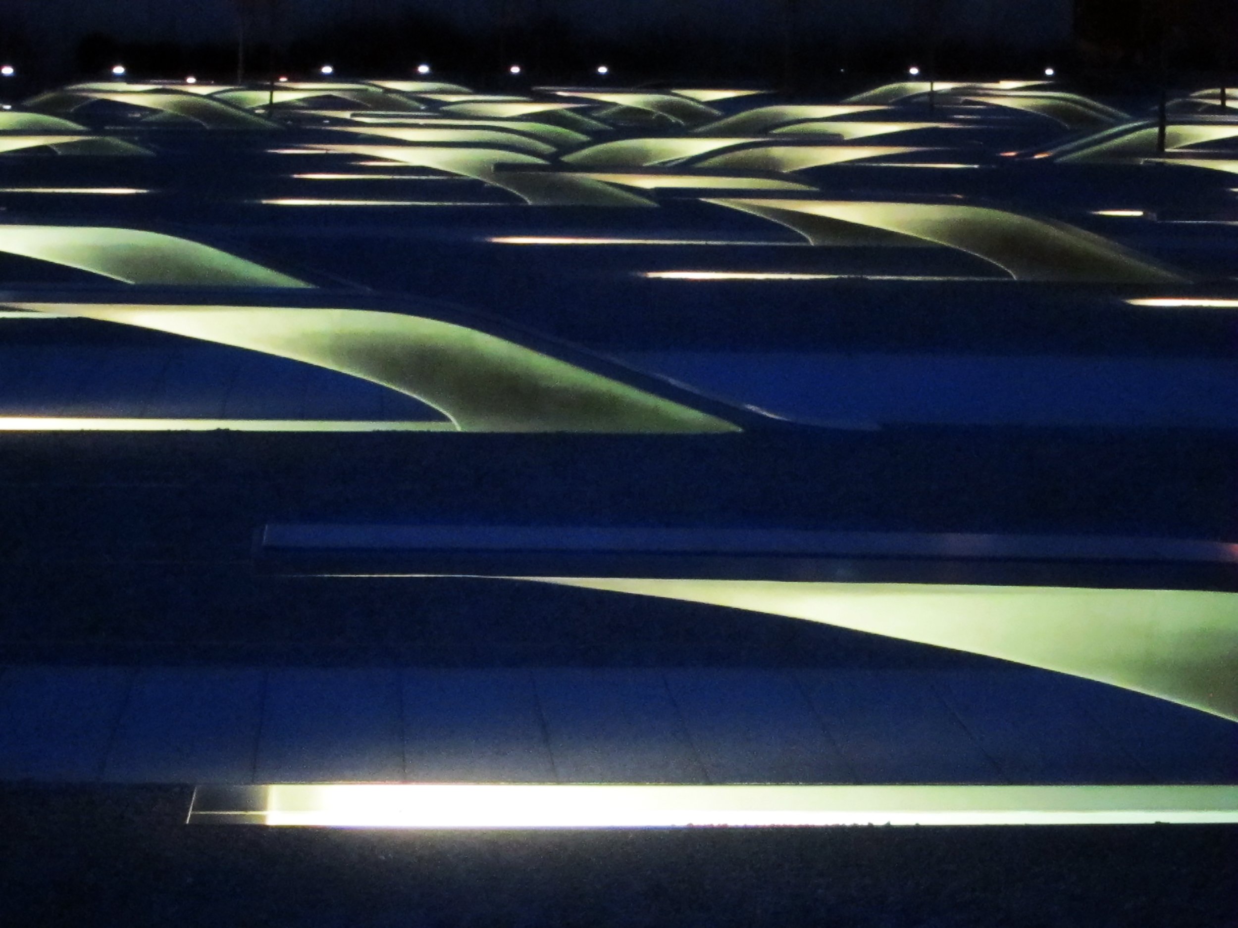 Facing the side of the Pentagon that was hit by a plane on September 11, 2001 is the Pentagon Memorial, a series of really overdesigned benches (one per victim), grouped by victims' ages and each atop it's own small pool of rushing water. The effect at night is actually fairly interesting, although the field of benches otherwise isn't as powerful as I expected, partially because of its location between parking lots and within sight of an elevated freeway, things which seem to lessen the impact of the memorial- it seems like an afterthought and a barely visited one at that. The day I visited I practically had the site all to myself.