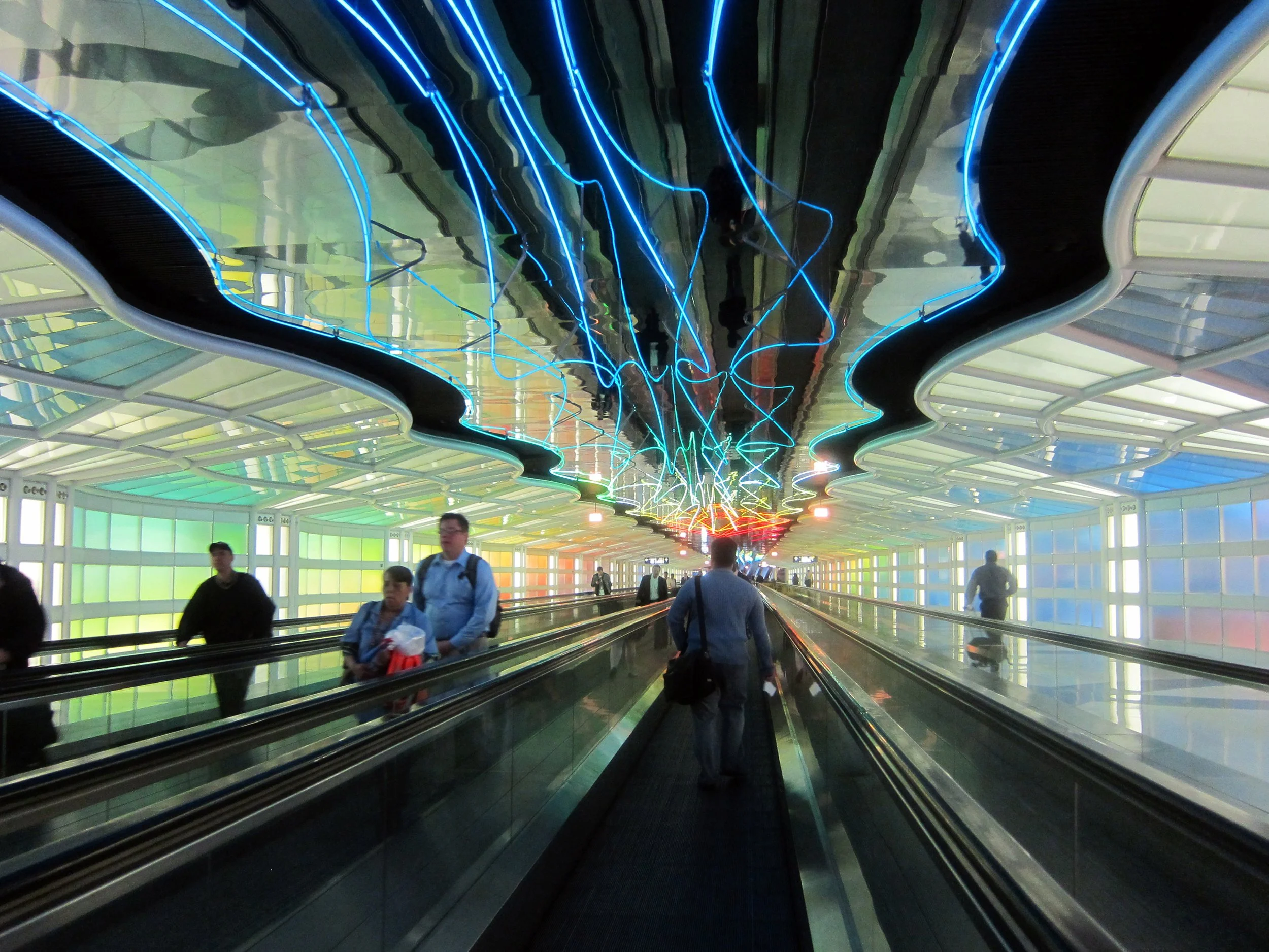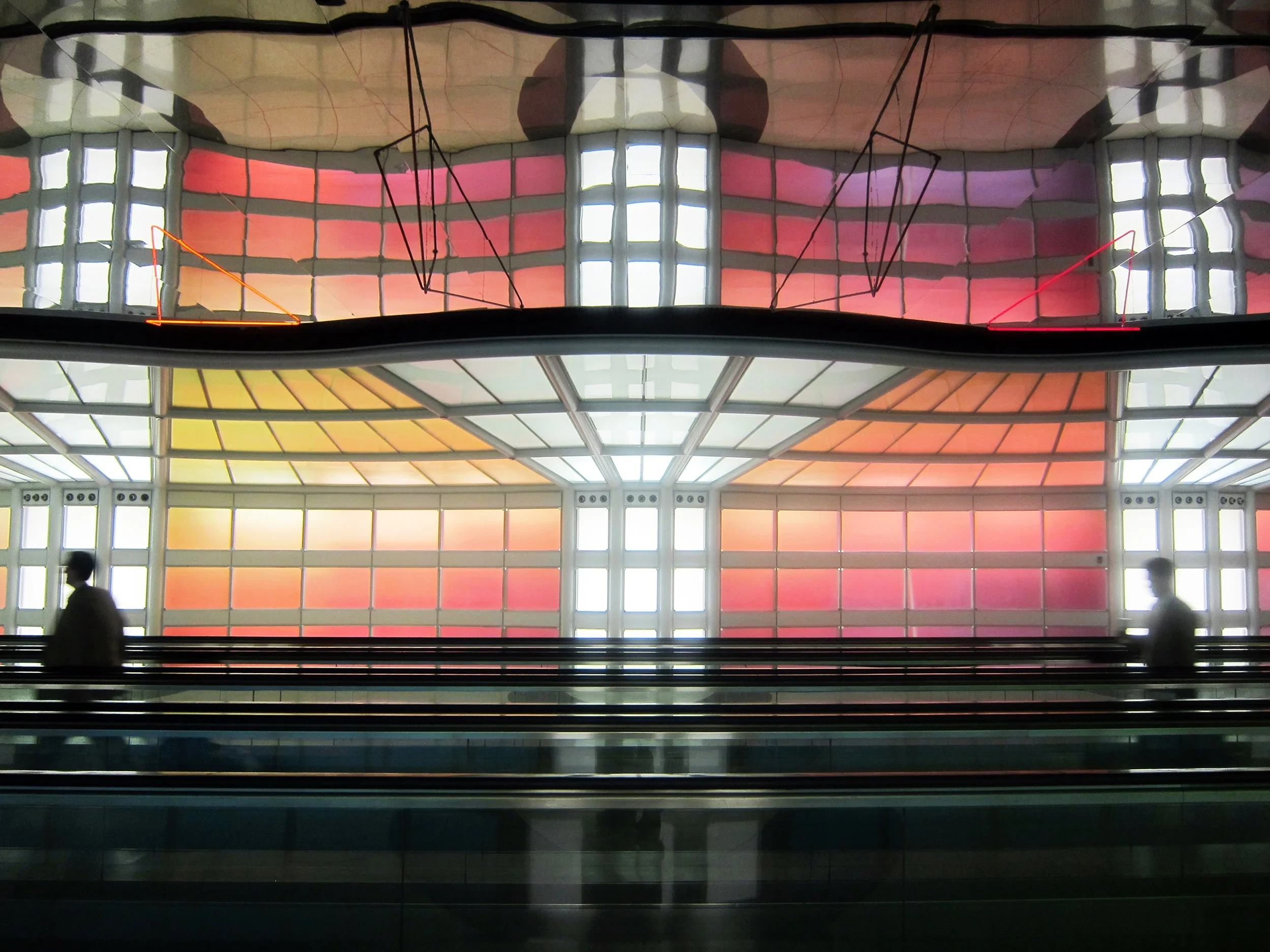 Even though Chicago O'Hare (like Newark) is notorious for delays, at least I'll be killing time or running to make a connection through a great looking building. Helmut Jahn's United Terminal One is a great building that holds up over time. This photo shows the often copied but never beaten underground tunnel that connects the B and C Concourses, with a neon sculpture overhead, glowing undulating walls on the side and perfectly appropriate late 1980s new age music playing- taken together they make you forget you only have 5 minutes to make your connection and they make you wish, as always, that you had once again just a little more time.