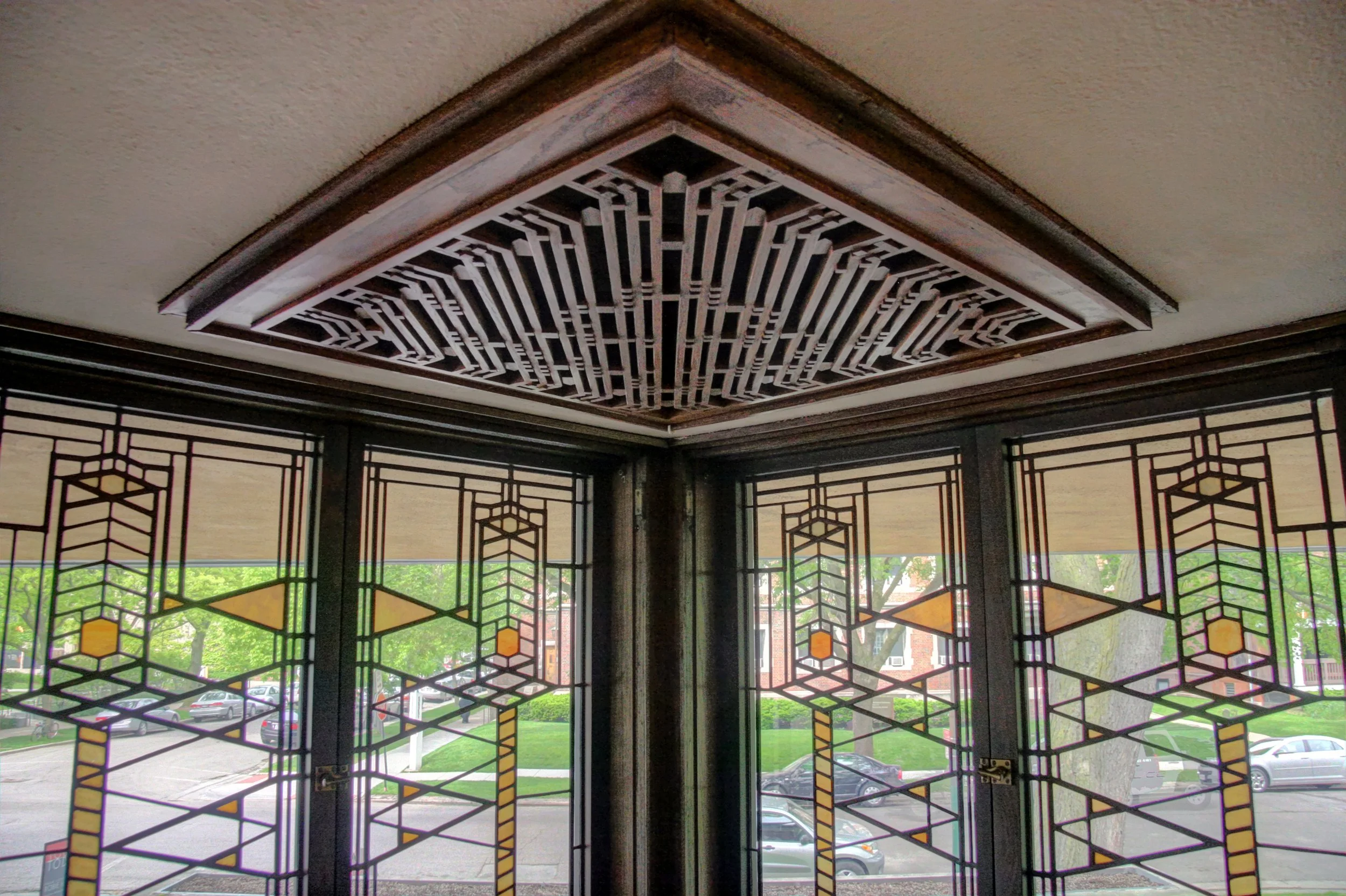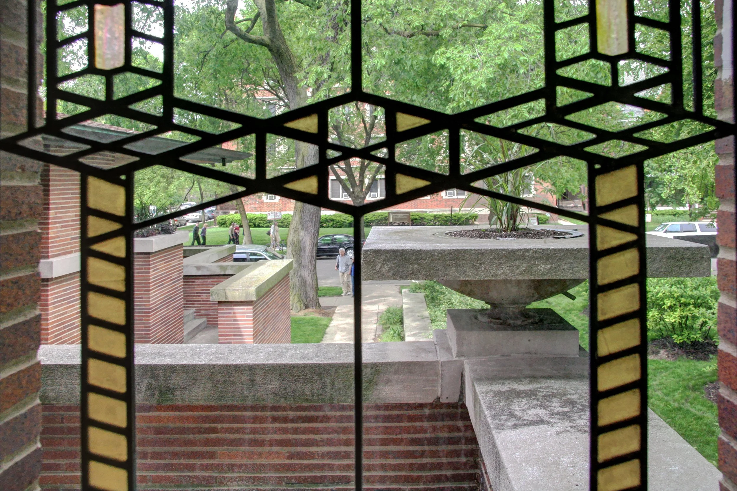 I took a special (and by special I mean slightly more expensive) tour of the Robie House that allowed interior photography, which explains this picture. This is the view in the main second floor living room, looking through the custom art glass and right out underneath that massive cantilevered roof.
