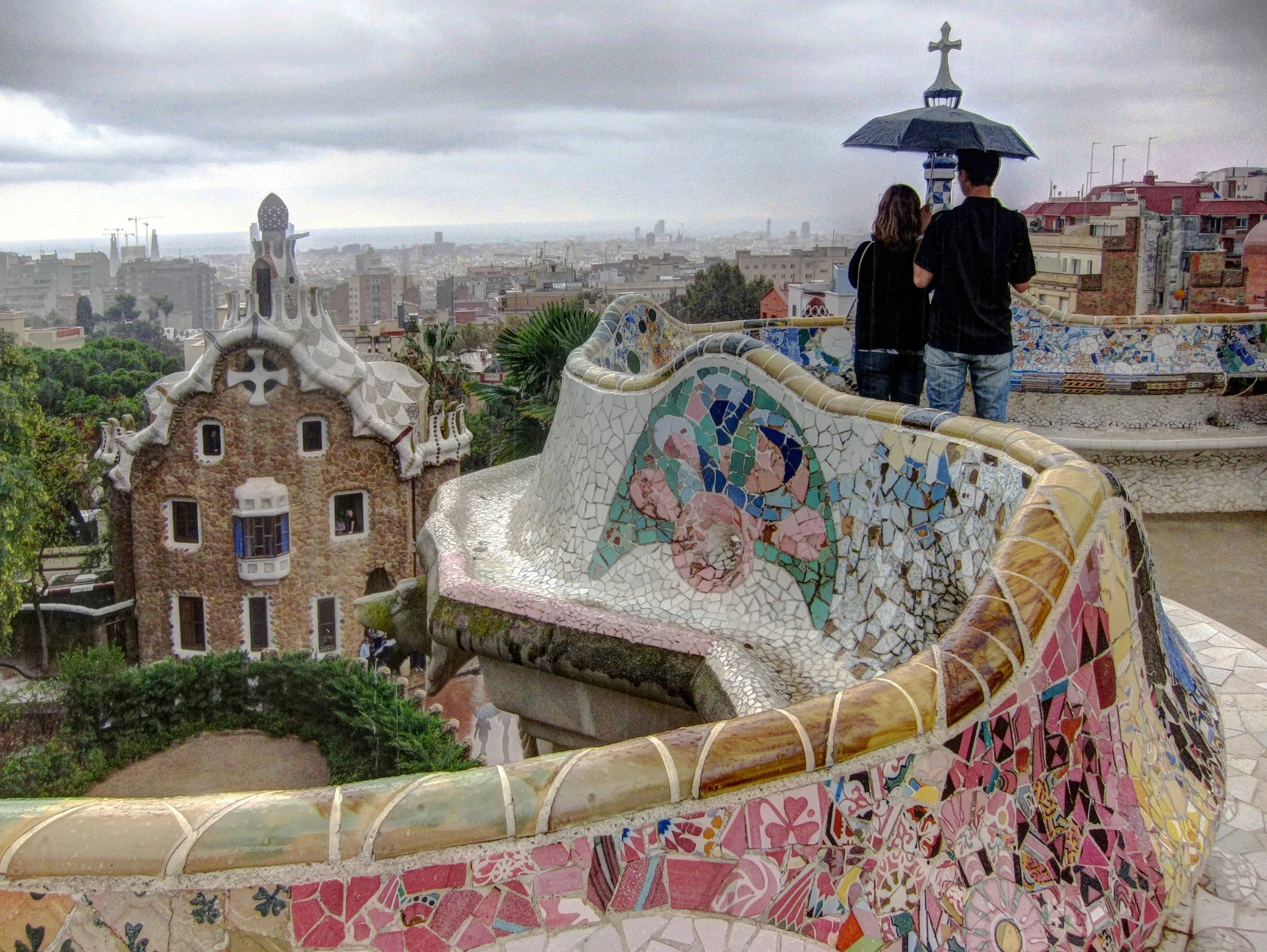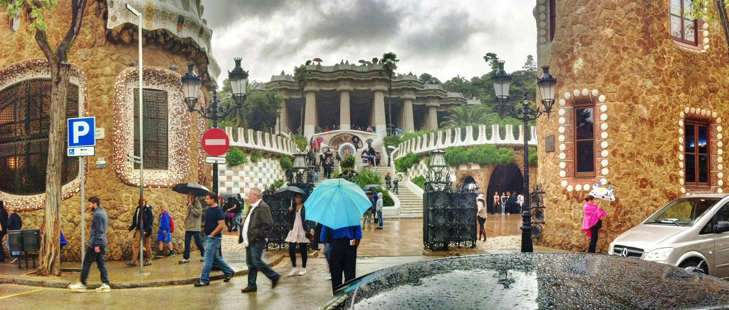 There are four big Gaudí sites (or possibly sights) in Barcelona and it's hard to see any one without wanting to see the other three. This is Park Güell, one of the four, where despite the threatening forecast and despite the gathering clouds and despite the heavy thunderstorms that started as soon as I got there, I still managed a visit, albeit a wet one.