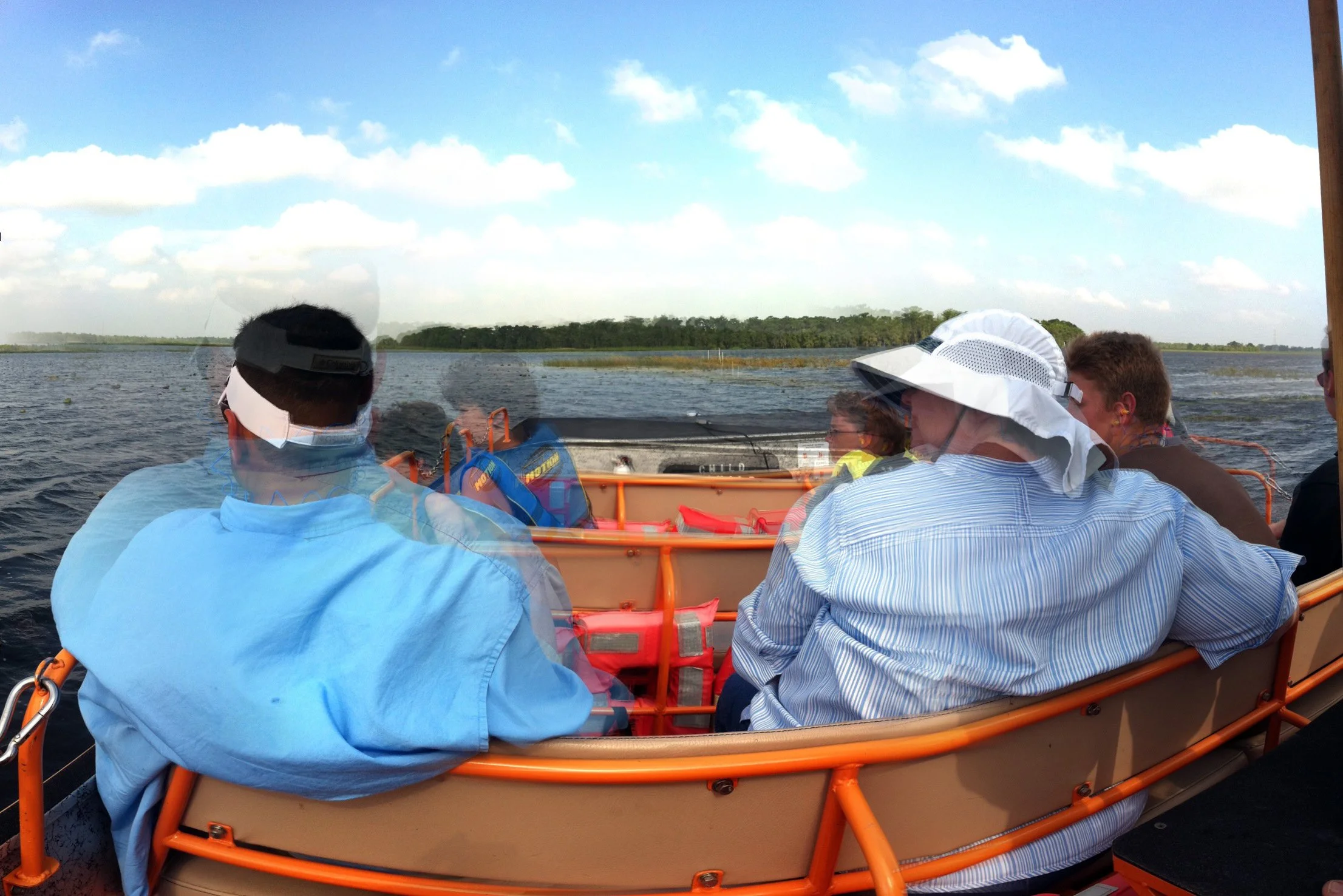 The boat crossed canals to the Sabine River and then headed into flooded grasslands in Louisiana. We would often stop to look at gators, although for some reason the captain always seemed surprised that the gators would hide under water as we approached. Maybe it had something to do with the giant, crazy loud, disruptive fan that powered our ride. Who knows.
