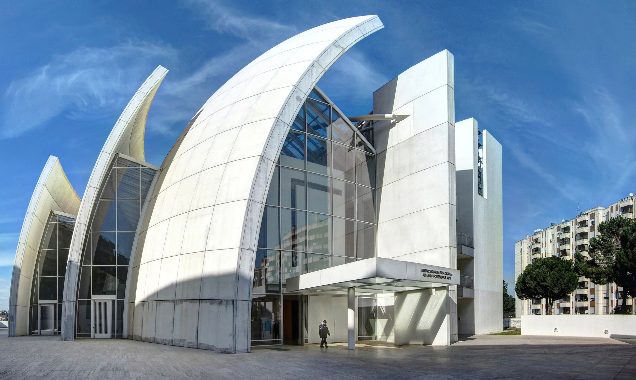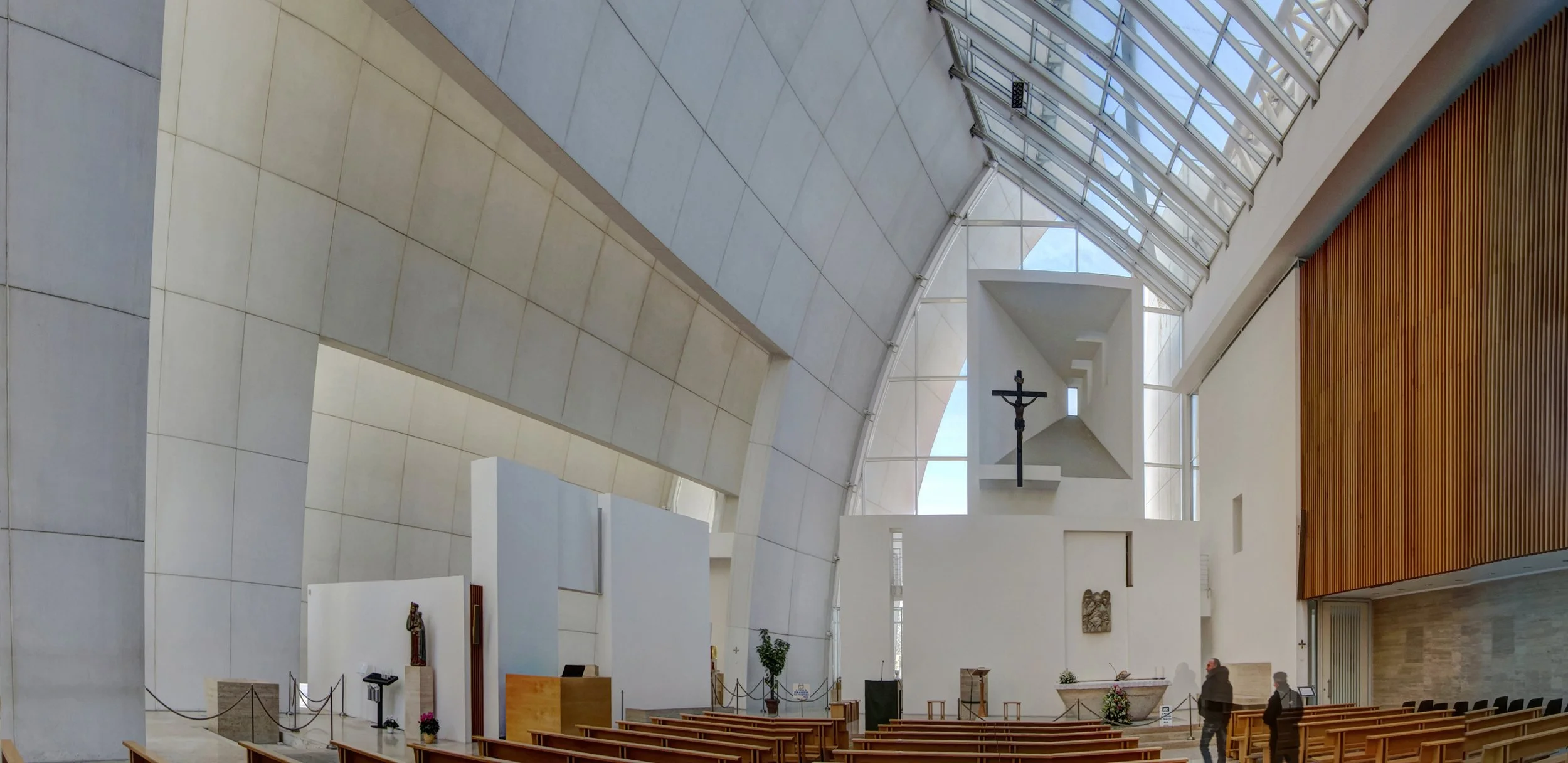 The church was originally called "The Church for the Year 2000" and was commissioned by then pope (and future saint) John Paul II, although the year 2000 was a bit optimistic for a church that did not open until 2006. Meier's design is by far his most sculptural, three curved shells dominate the design and make you think (from the outside at least) that it was more than worth all of the trouble it took to get there.