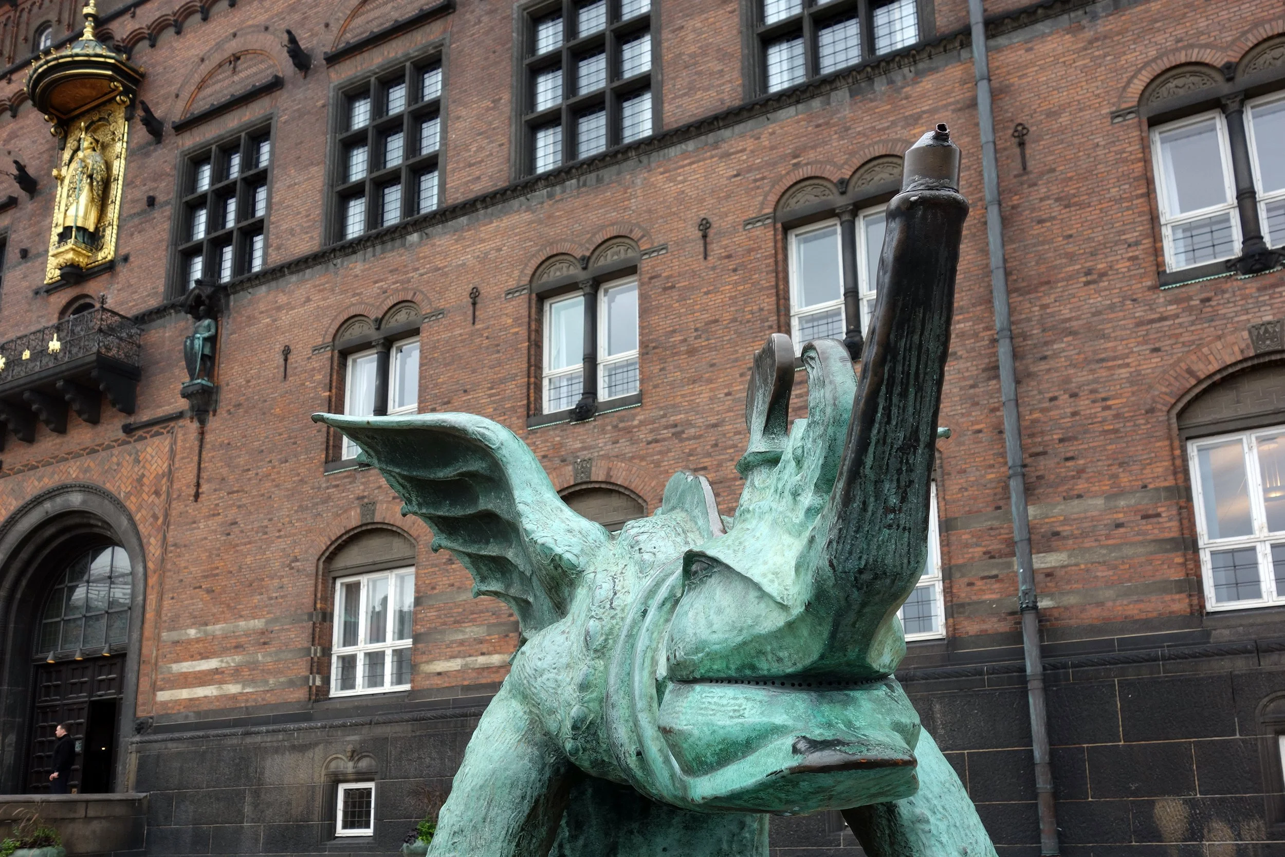 If Paris was a glorified layover then Copenhagen was a literal layover. I had originally planned to take a train out of Paris toward my next destination but soon found myself frustrated by the schedules and the length of the journey. As an alternate I looked into flights and found myself shocked that I could fly far cheaper and quicker than the train. Then (of course) I took things one step too far, booking a flight on SAS specifically because of a long (ten hour plus) layover in Copenhagen. A chance to spend some time quick, quality time in Denmark took hold of my imagination and soon I found myself here at City Hall Square on a cold, overcast Scandinavian morning, face to face with some sort of green, winged dragon looking thing. Who could ask for anything more?