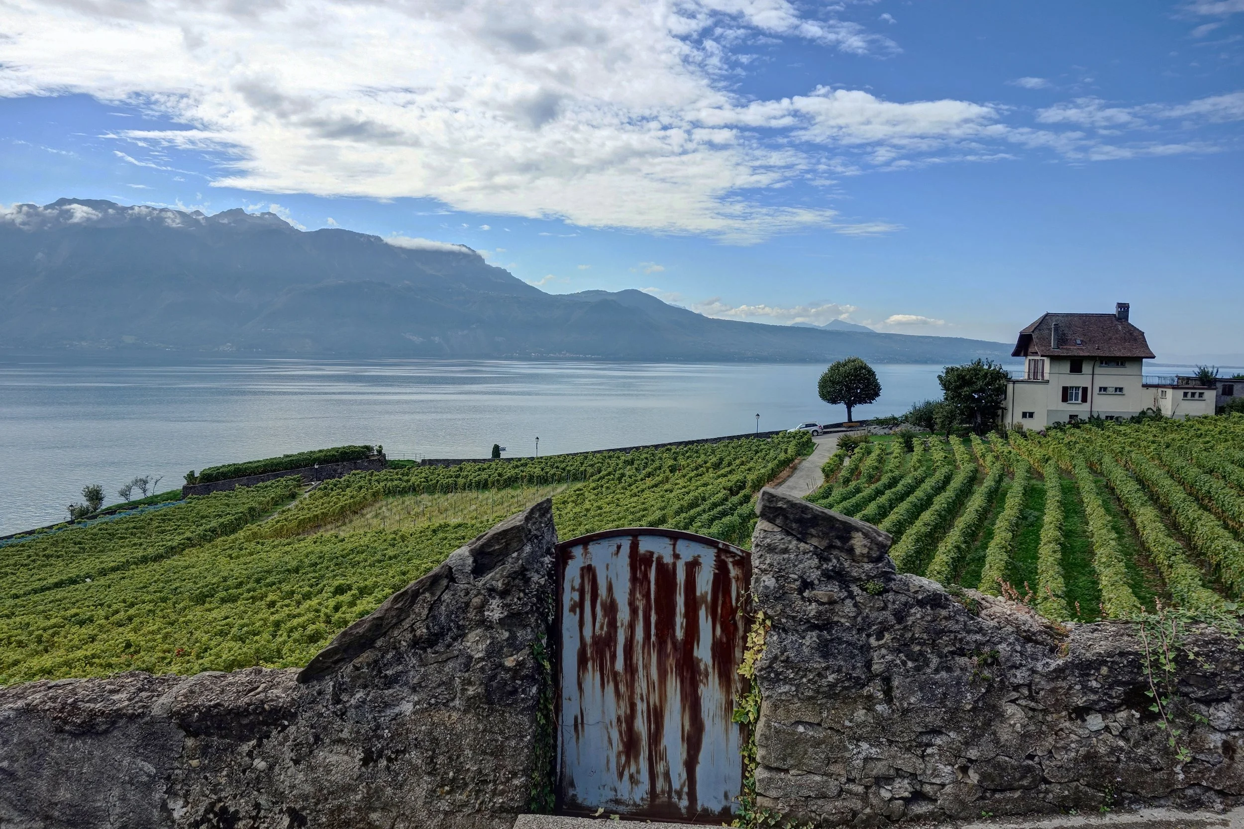The area of the terraces is called the Lavaux, a twenty mile stretch of lakefront that for well over a thousand years has been home to vineyards. Now a UNESCO World Heritage Site, it is dotted with small towns and wineries and served by two commuter rail lines, one at the top of the hill and one below. Between them there are many marked walking paths along side the stone walls that allow you to easily see the Lavaux at your own pace and allow you to wander off in whatever direction you want. I roughly followed a path that was recommended to me by the woman at the Lausanne TI office, one that started at the railway station in Chexbres and then went to St Saphorin and Rivaz. At every step there was another amazing view of and from the terraces, as the lake and the mountains and the view toward Evian (France) all tried to steal my attention.