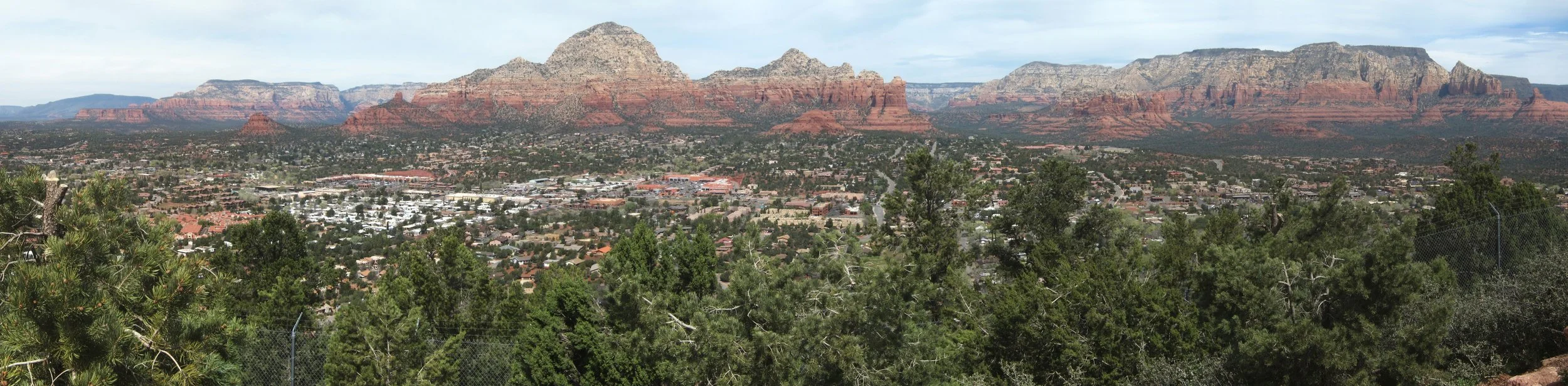 Phoenix is fine. There is enough to do there to keep just about anyone occupied for a weekend, but its hard to stay in if you know what else is out there. If I have the time, I’m going to take that rather long day trip up to Sedona, only two hours north of Phoenix but a few thousand feet higher and also (in just about all respects) a world away., as you can see from this obligatory long shot panorama view from atop Airport Mesa in Sedona.