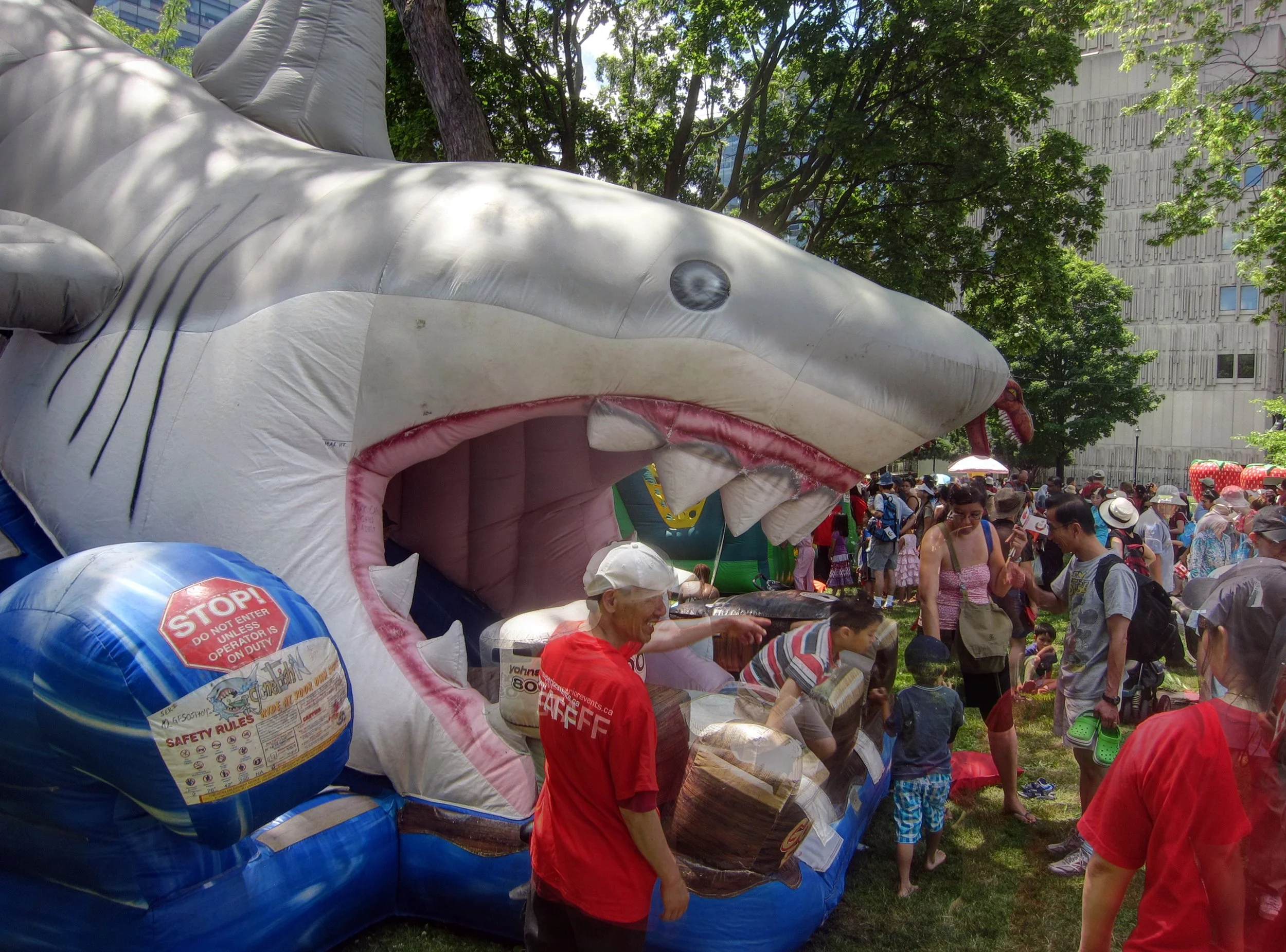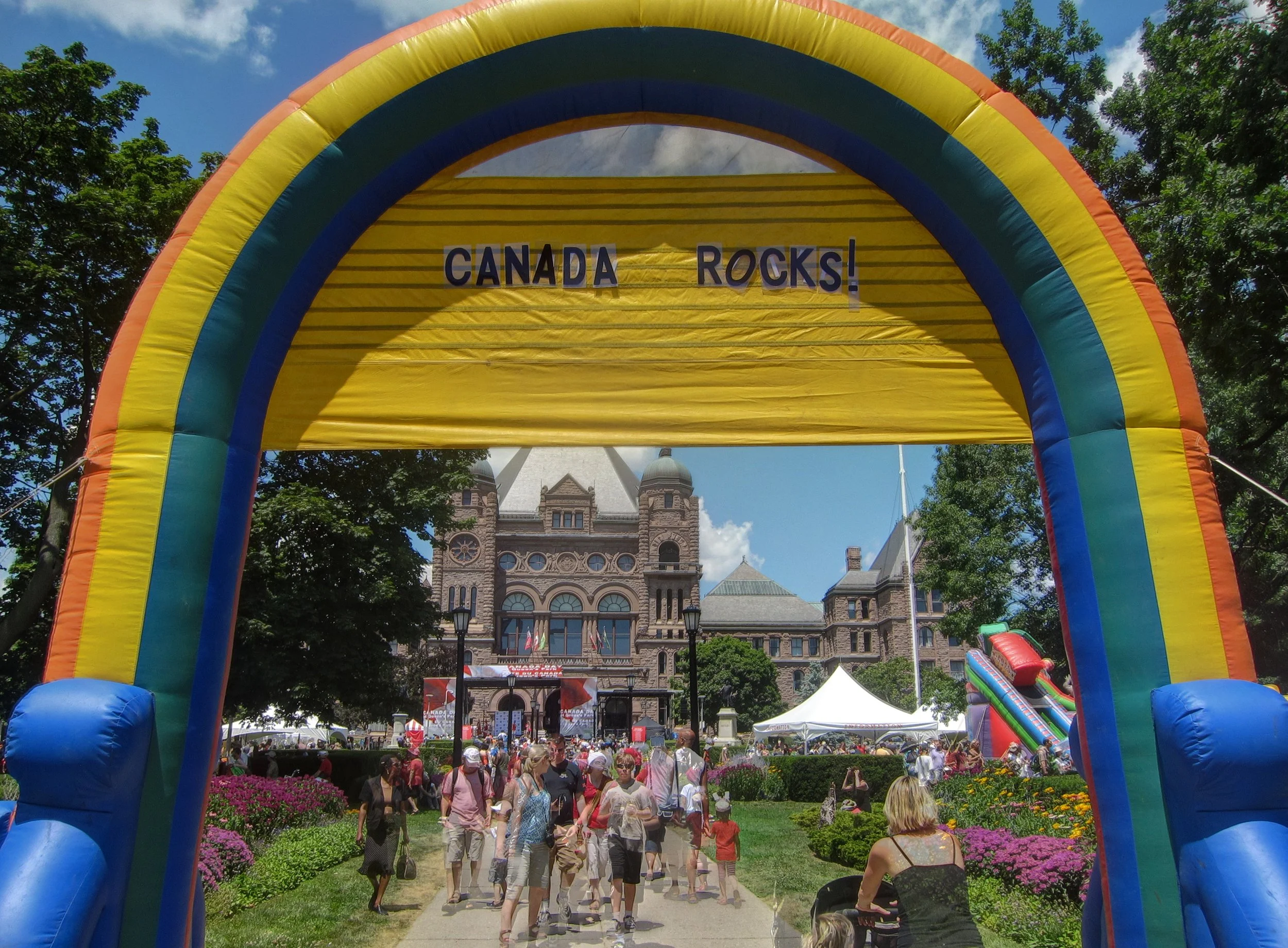 Today is not just any day, it's Canada Day (take that, other countries). It's the day commemorating the partial split of Canada from the British Empire (Wikipedia says that the split wasn't complete until 1982). There are all sorts of celebrations, including this one at Queens Park where strange local bands, inflatable shark slides, tiny flags (I even took one) and maple tinged alcohol all help to promote a healthy sense of self worth.