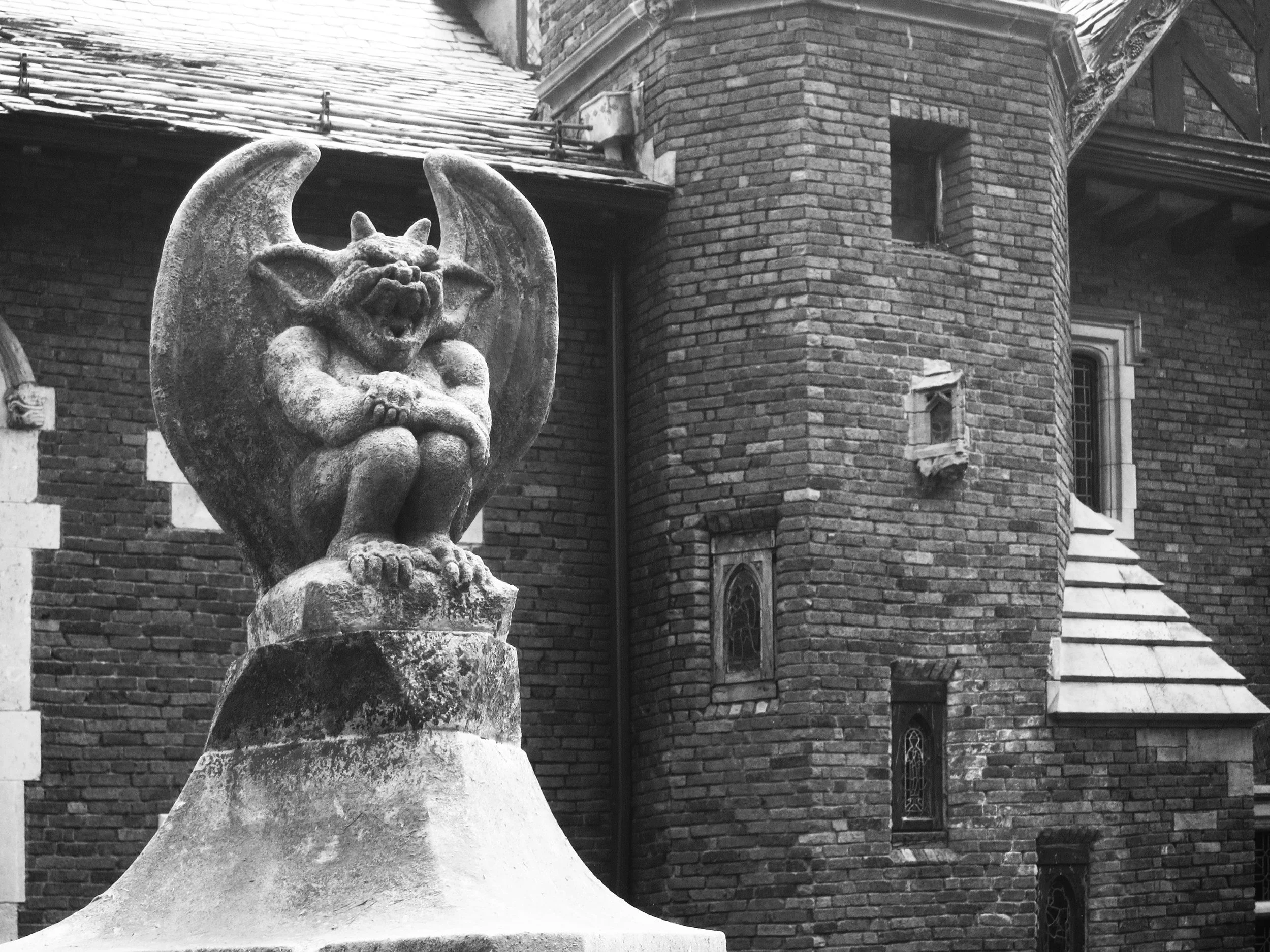 Some black and white exterior photos of Glynallyn Castle, a historic mansion near Convent Station, New Jersey that is open as part of a design orientated month long charity drive called "Mansion in May” benefitting Morristown Memorial Hospital, The house's forty rooms are decorated by forty different design firms (some good, some bad, some in-between), but all interior photography was prohibited this year so you're going to have to just imagine what it looked inside as you’re just left with a few pictures of the very impressive historic house and its grounds.