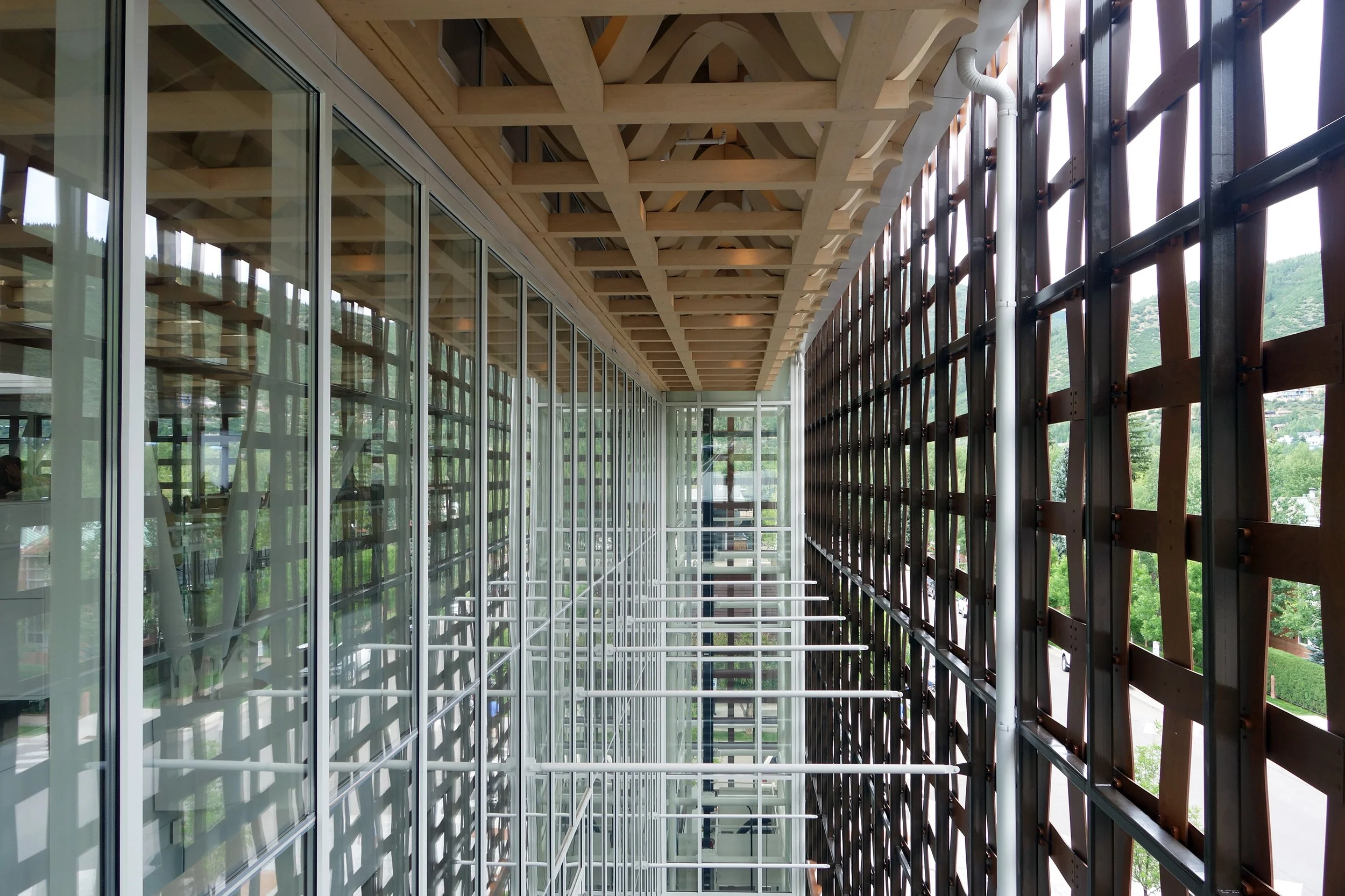 Fast forward two years later. It’s now 2015 and I’m back in Colorado and back in Denver and driving (again) back out to Aspen specifically to see this- the spectacular Aspen Art Museum designed by Shigeru Ban. It’s exterior is defined by a woven wooden screen, that covers galleries and a rooftop cafe and terrace and some stairs that are way more fun tan they should be.