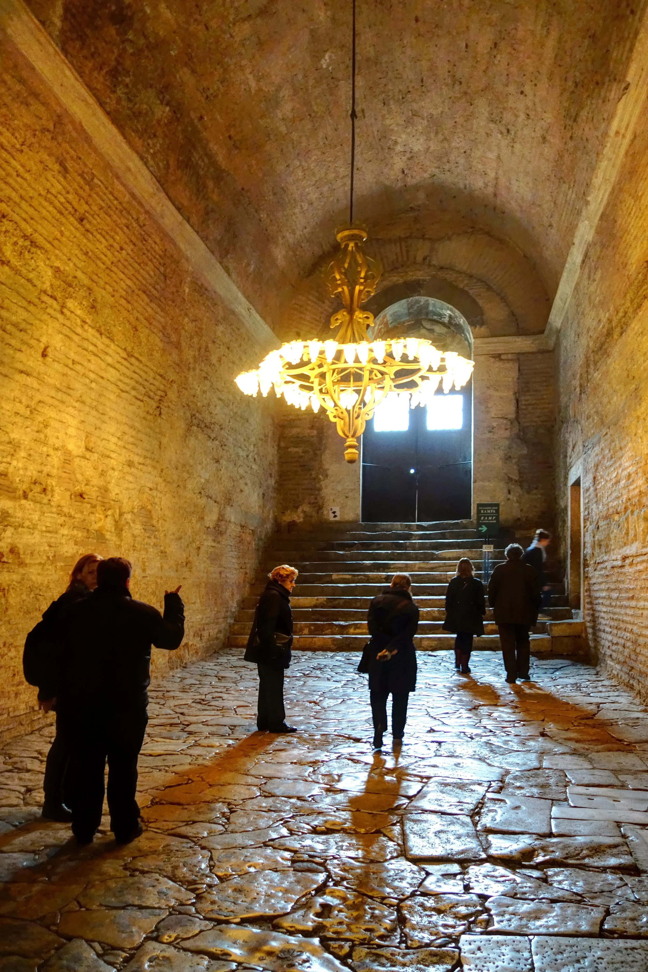 From the second gallery level of the Hagia Sofia, this is a view back towards the central dome and the center of the church... or mosque... or museum. Having survived 1,500 years of emperors, sultans, crusaders, sieges, wars and earthquakes, the columns and walls and stairs and dome still stand in (just about) the same place that all of those countless slaves originally put them in.