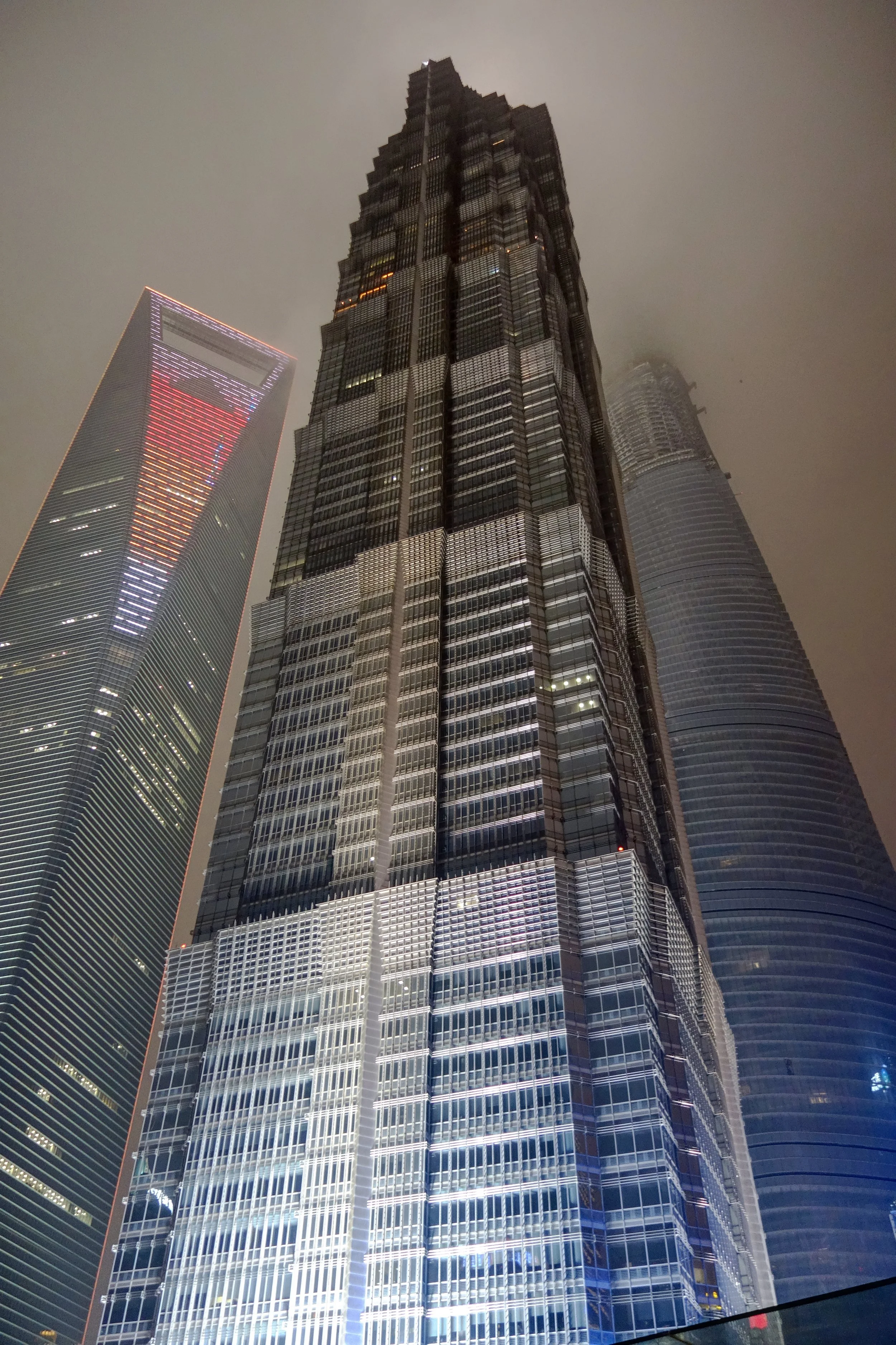From those elevated sidewalks, this is the view looking up at the three monstrous super tall skyscrapers that anchor the center of Pudong, all right across the street from each other. In the middle is the already mentioned 1,380 foot high Jin Mao Tower designed by Adrian Smith of (then) SOM. On the left is the taller 1,614 foot high Shanghai World Financial Center designed by Bill Pederson at KPF, all lit up for the night time. On the right, disappearing into the fog and still under construction is the 2,073 foot high Shanghai Tower designed by Gensler.