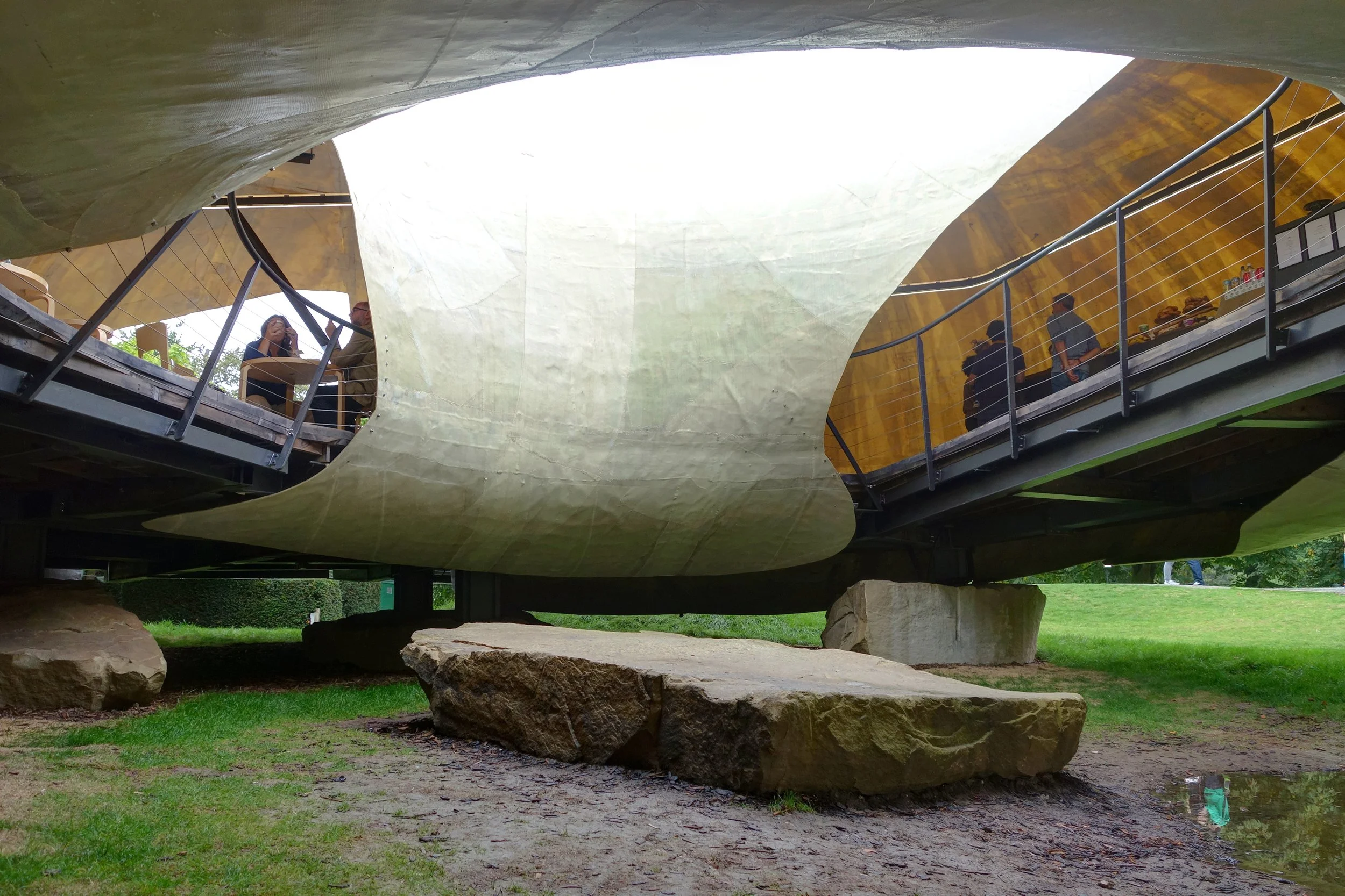 Much like New York’s own Warm Up canopy at PS1, every summer for just a few months, the Serpentine Gallery in Kensington Gardens opens up a temporary pavilion at its front door for the city to enjoy. As always it includes a café and a few places to sit, but otherwise it’s architecture for architecture’s sake, and that’s not a bad thing at all. The 2014 pavilion was designed by a Chilean architect named Smiljan Radic and he follows in the footsteps of previous pavilion architects including Oscar Niemeyer, Zaha Hadid, Frank Gehry, Jean Nouvel, Toyo Ito, SANAA, Daniel Libeskind and Rem Koolhaas, among others. Radic’s approach seemed kind of boring- from the pictures I had seen before I arrived, it looked like a collection of rocks and not much more. In person it was a revelation. That big rock was really a hollow donut with a partially translucent fiberglass skin and all sorts of torn and punctured windows that framed the gardens beyond.