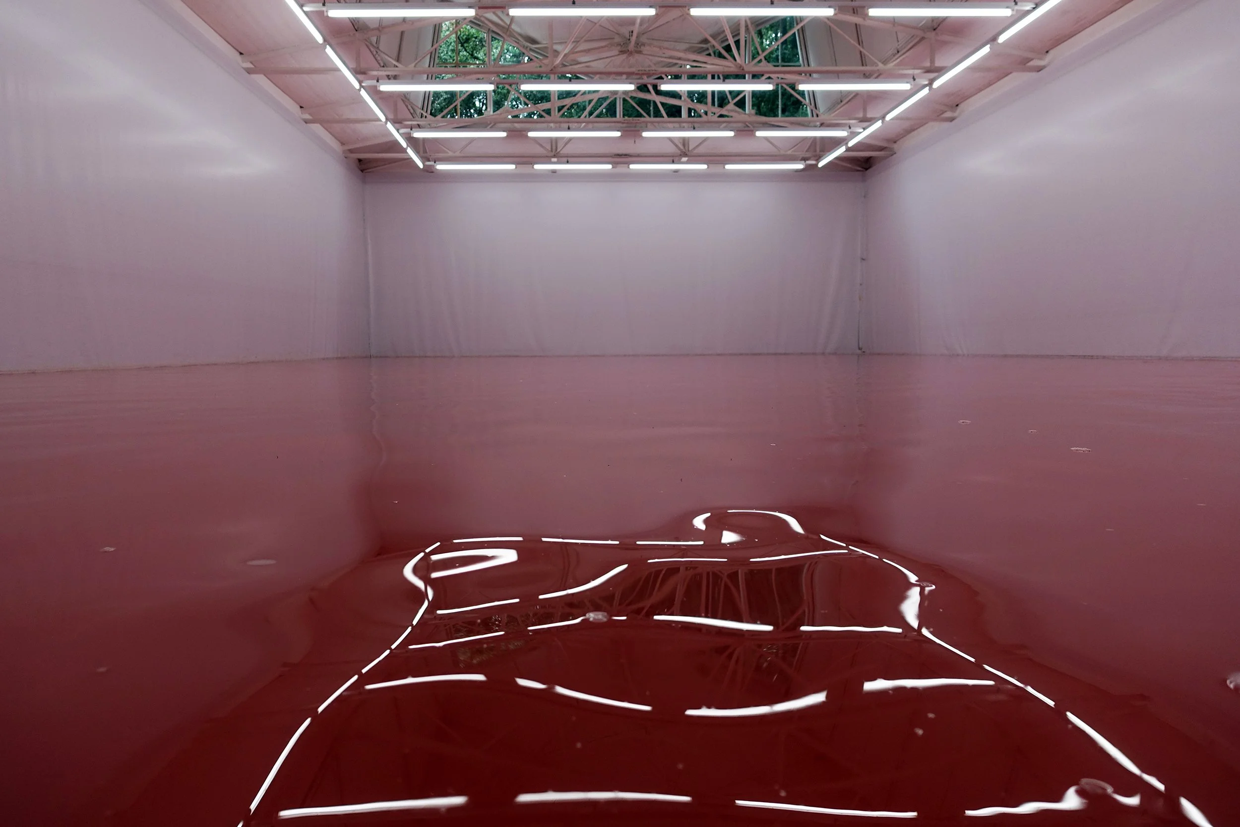 Some of the pavilion installations were better than others. My rule has always been that if I go to a contemporary art museum and like more than a third of the work, then I have just been to a damn good contemporary art museum. Such a seemingly low threshold is nothing personal, it's just the nature of contemporary art and experimentation. I'm not sure if the 2015 Venice Art Biennale beat my totally arbitrary threshold or not (it probably didn't), but sometimes even in failure there is much to admire. Take for example the Swiss Pavilion by Pamela Rosenkranz. Right away when you see something with a nineteen word convoluted title it's a bad sign, usually it's compensating for something lacking in the work. And you end up with something like this. A room flooded with a mystery liquid that is supposed to represent the aggregate skin tone of white europeans, and with a smell that could be described as similar to a lot of skin lotion but could better be described as just plain horrible. Despite the smell and despite the pointless concept, what saved this putrid lake of liquid skin were the reflections of the light fixtures, something which may have been unintentional but were in the end the one thing that made a visit to the Swiss Pavilion worthwhile.
