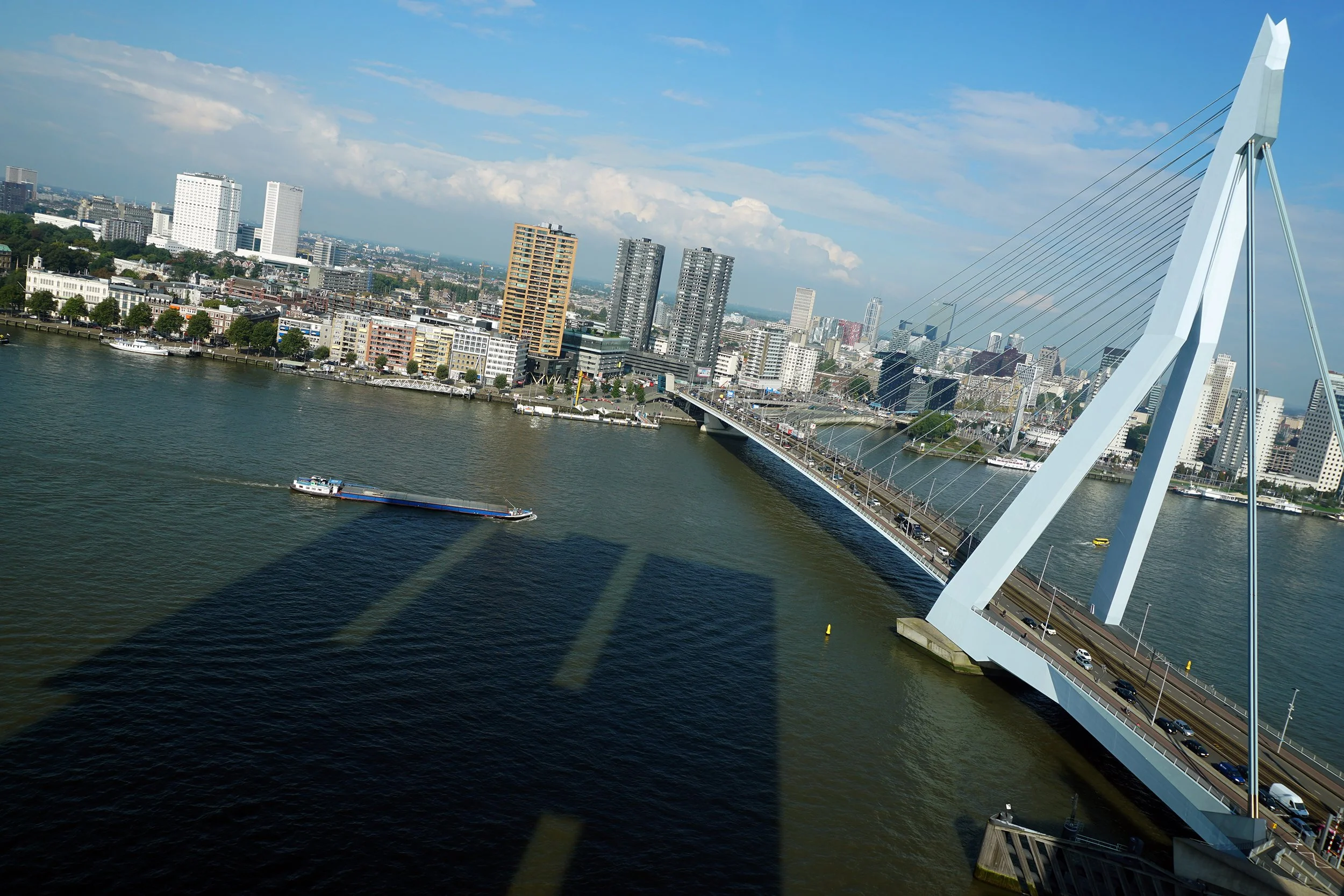 We’re going to end our one day, one night visit to Rotterdam with two pictures of the same thing, the view from my 19th floor at the nhow hotel at de Rotterdam. The first picture shows the creeping shadows of de Rotterdam chasing the bridge, while the second photo shows the bridge and the city as night finally fell. Art, architecture and one hell of a view indeed.