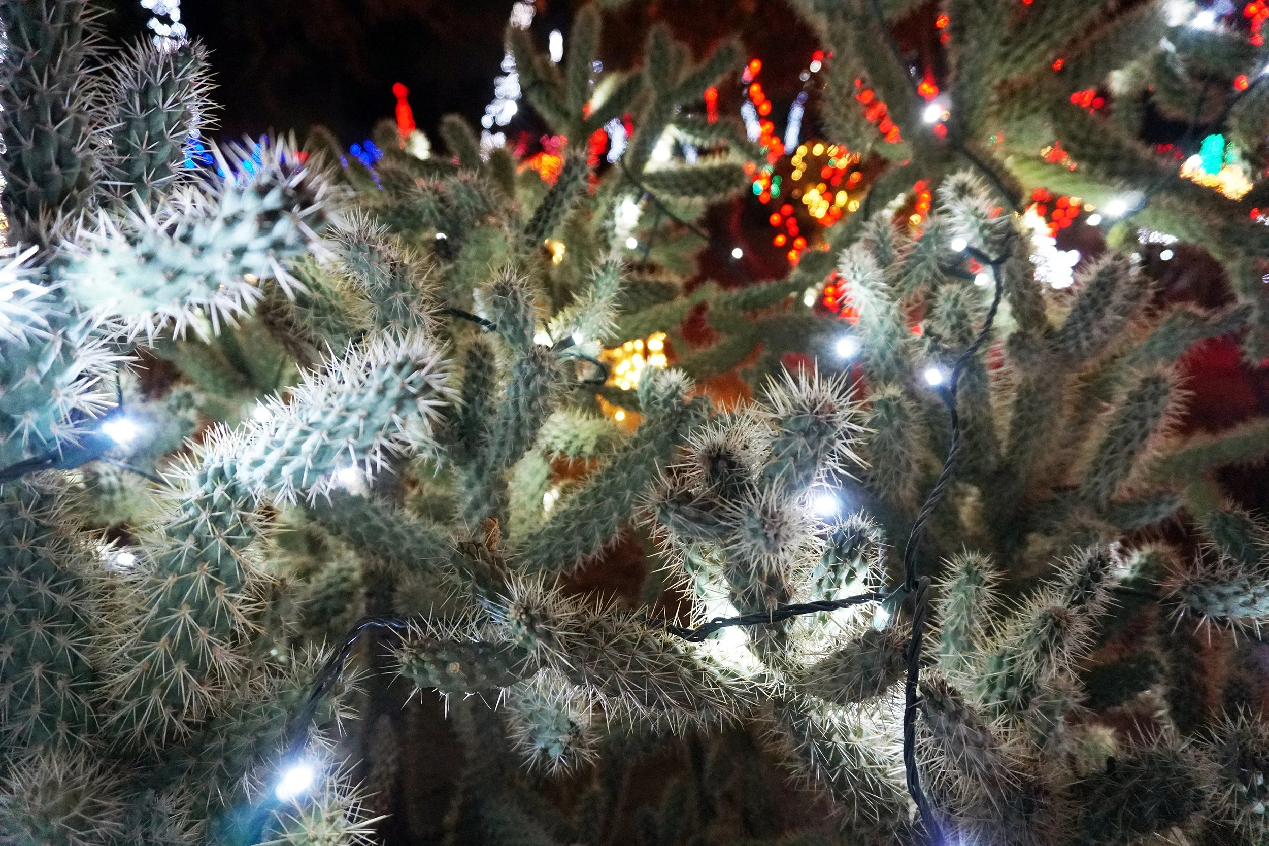 If you decide to be a local at Ethel M.’s the week before christmas, there are a few things you’ll find. The first is how hard it is to find a parking spot (it’s really busy), then you’ll find a massive line for hot chocolate. In between those two you’ll find the reason you came. Ethel M. lights up all of the cacti in her cactus garden with christmas lights, and although that sounds a bit goofy, the result is actually quite lovely. And in between there are all sorts of holiday extras like a sweaty desert Santa and a fake ice skating rink, where locals walk (and then fall) on the fake ice on their skates, forgetting (or not being told in the first place) that the skates are there for gliding and not walking.