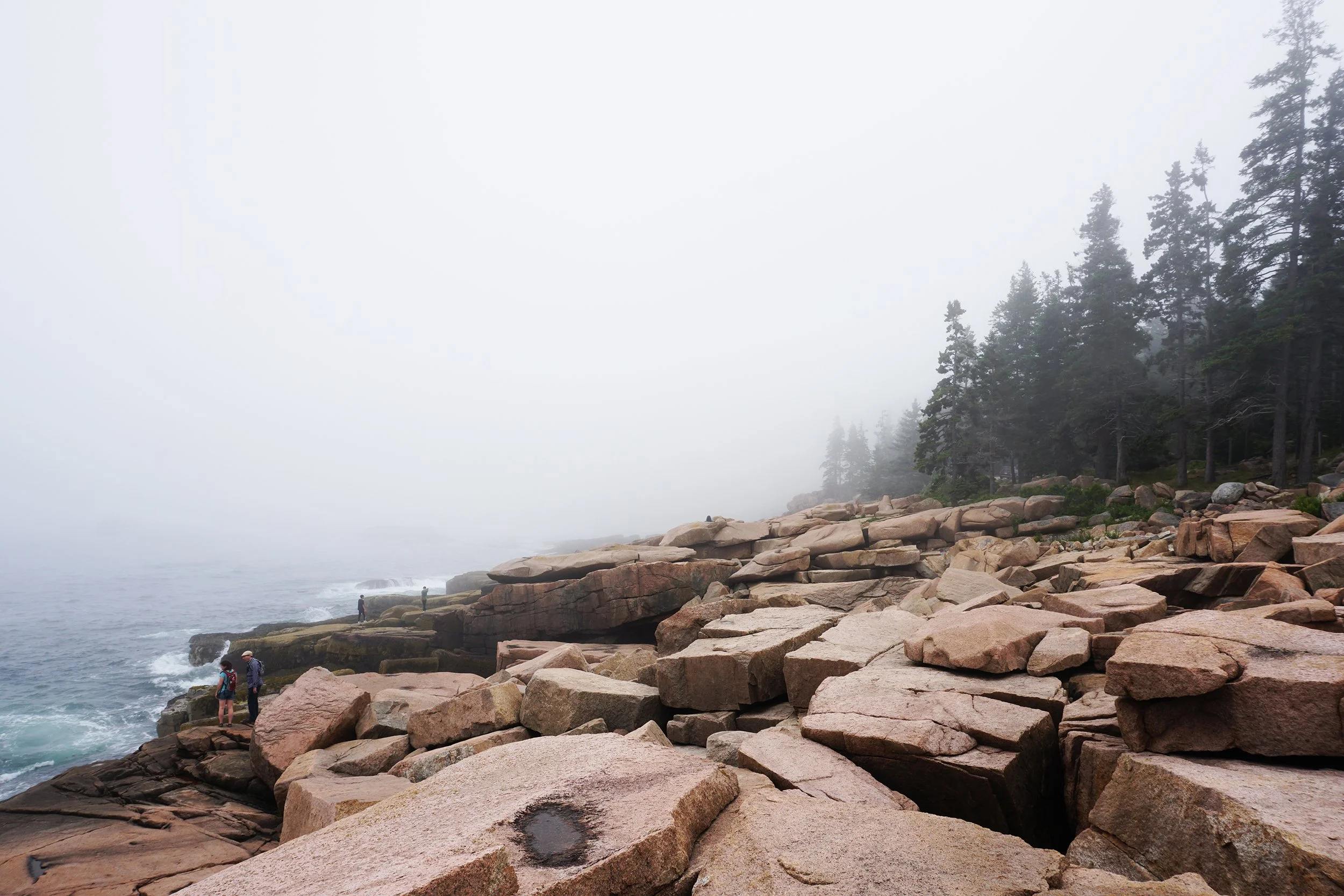 Longtime fans of the slideshows will know that this was not my first trip to Maine. Of course so many trips to the same place doesn’t preclude me from taking the same picture again and even using the same (or suspiciously familiar) descriptions again and again. After all, how many different ways can you really describe the same classic Maine coastline and the pink rocks and the gathering fog?