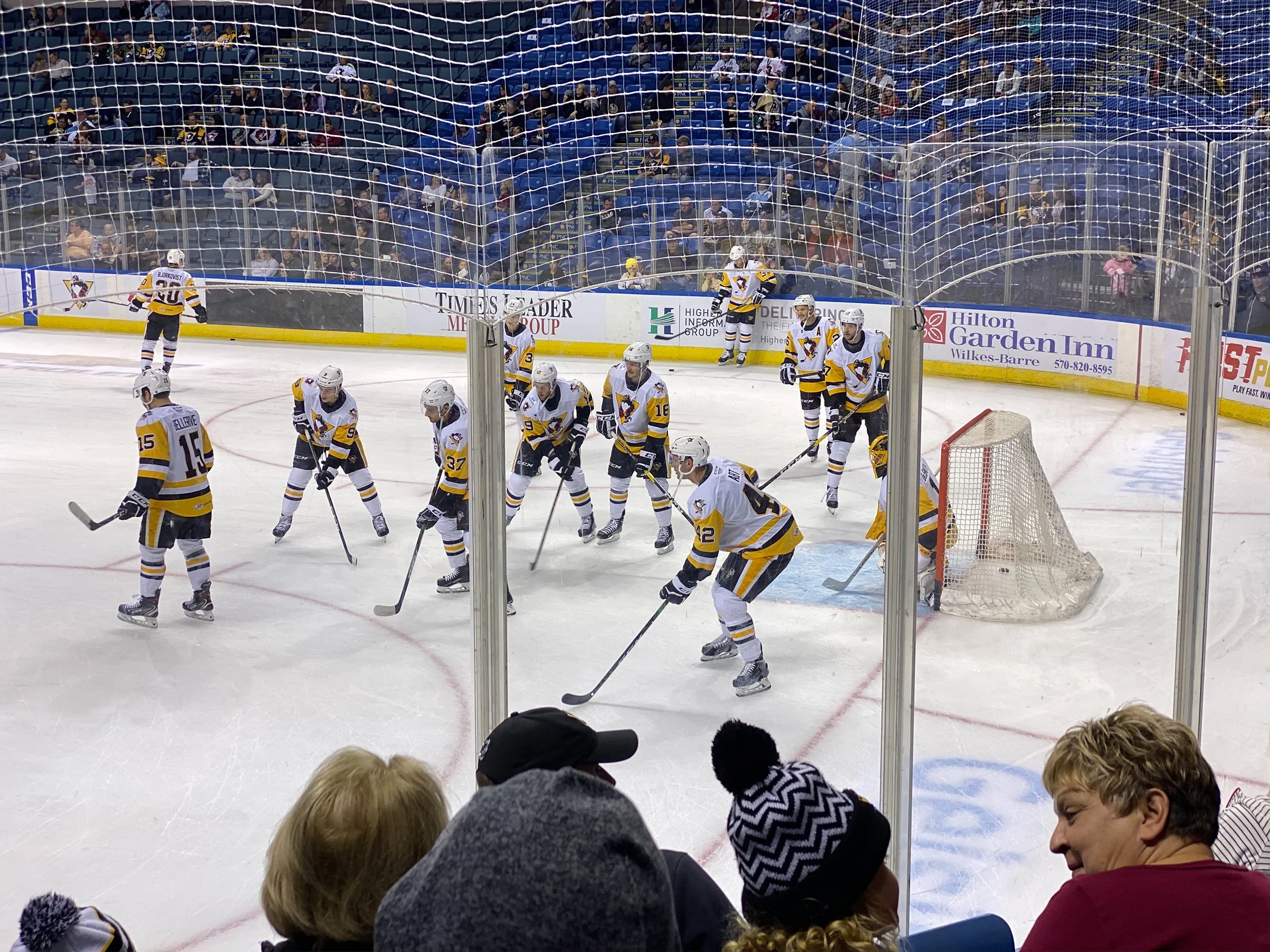 Since we booked a non refundable hotel anyway, we were at least in luck to find ourselves at the home opener for the local minor league hockey team. The Wilkes-Barre Scranton Penguins are named because they are an affiliate of the Pittsburgh Penguins, which makes sense since there are literally no penguins anywhere in Northeastern Pennsylvania. And that includes the Penguins’ mascot Tux (pictured below) who looks nothing like a penguin and more like a generic bird with furry skin, opposable thumbs, bulging lidless eyeballs and a person hiding inside.