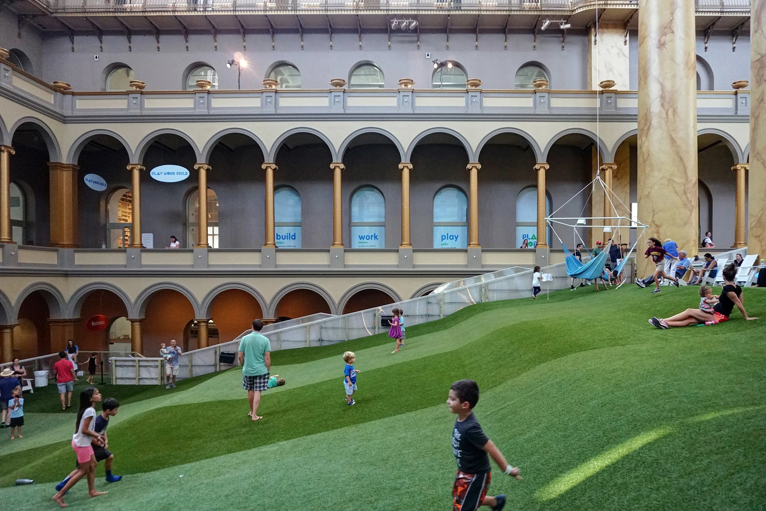 We’re now headed to a rather toasty Washington, DC for some quick pictures from the summer 2019 installation at the National Building Museum. It’s actually pretty good this year. Called “Lawn” it’s, well, a (great big fake) lawn by David Rockwell.