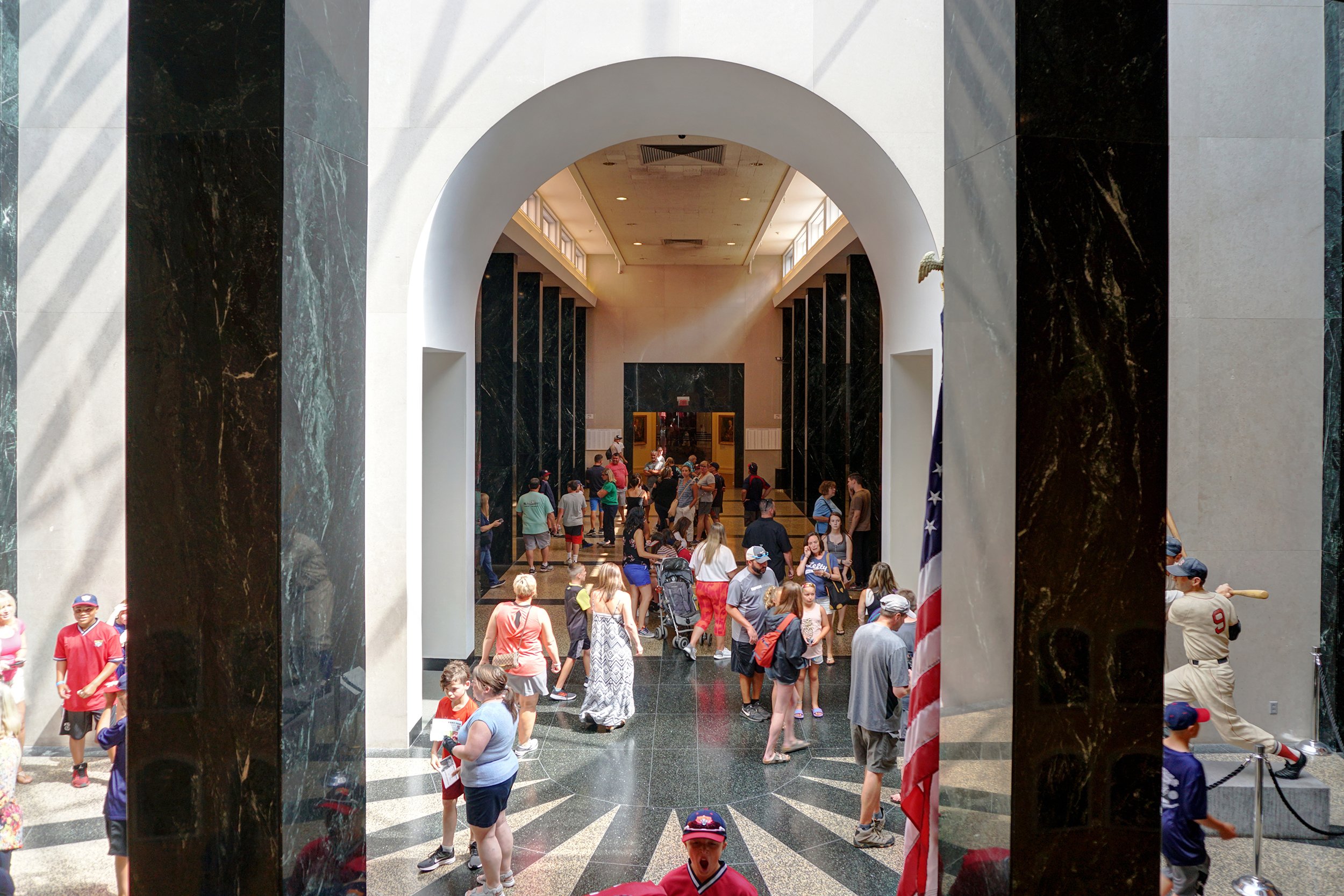 So what can you expect to see at the National Baseball Hall of Fame and Museum? Well, to start, you can expect to see a lot of people. It doesn’t matter the time or what day you’re there, you’ll never have the place to yourself. The museum is well done but it’s organized a little half-assed to be honest. It’s a three story museum that asks you to start on the second floor (where a terrific introductory film starts you off), then you go up to the third floor and then finish on one. In between there are all kinds of really interesting artifacts and exhibits, although fighting through the crowd to see every one starts to become impractical and tiresome at some point. As for the Hall of Fame itself, it’s a little of a letdown to be honest. It’s on the first floor at the end of your journey, but it feels a little like an uninspired, slightly postmodern mausoleum, and some of the portraits on the plaques look absolutely nothing like the real people they represent.