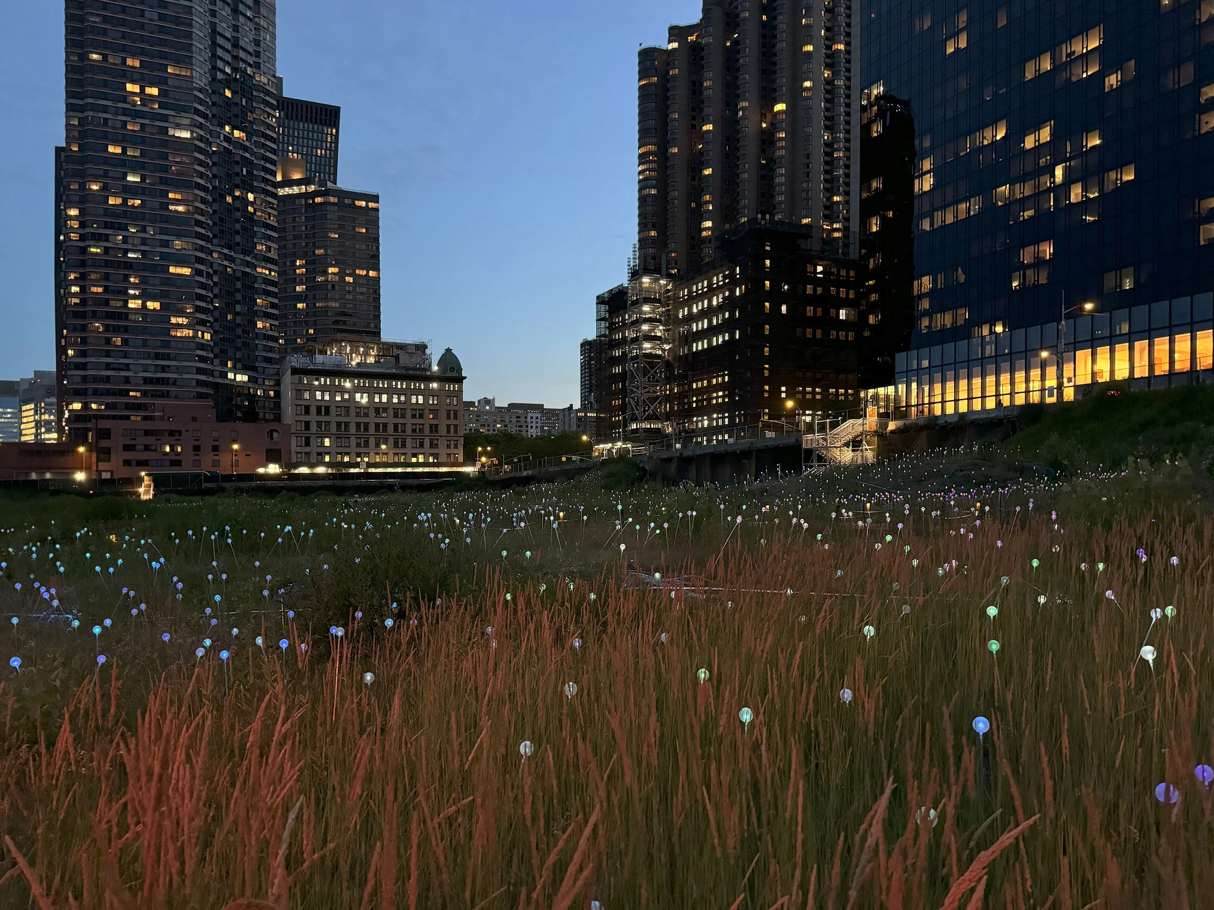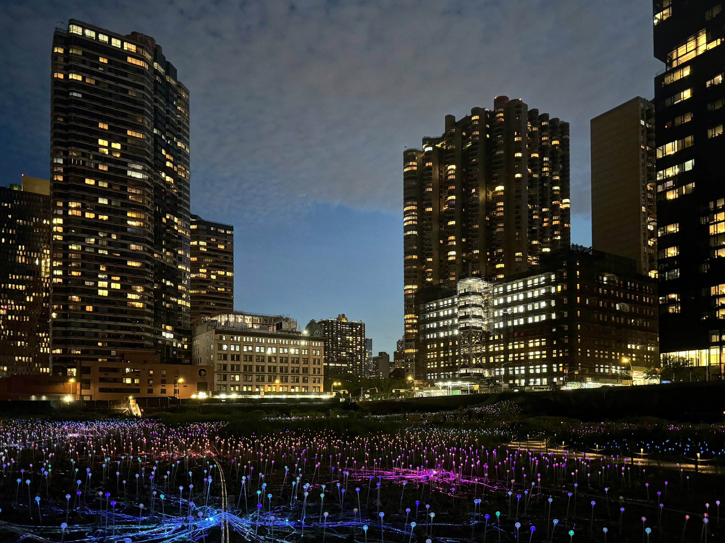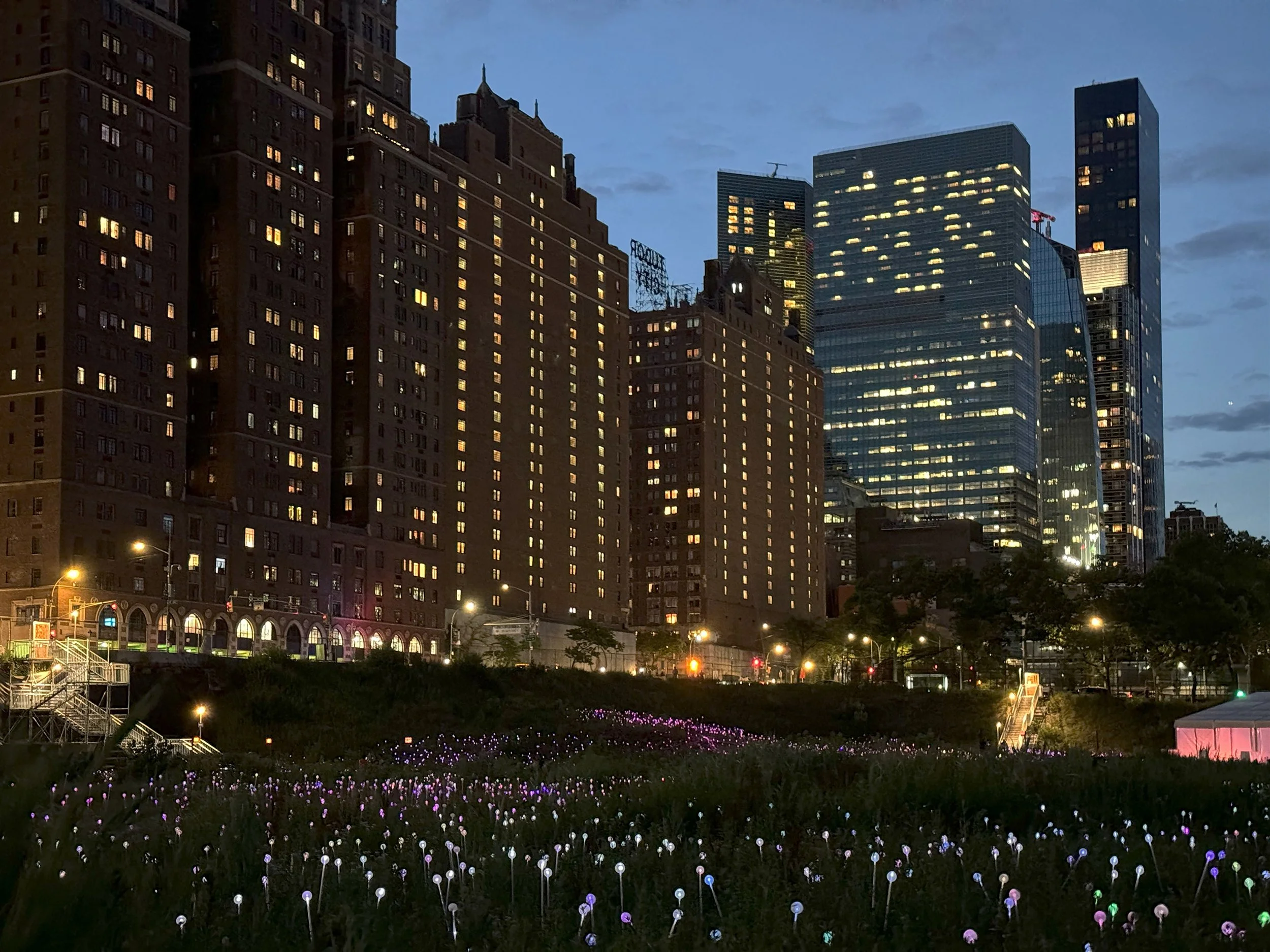 In the past, the big empty site a block or two south of the United Nations was known as the ConEd site, this makes sense since because before it was a big empty site it was the home to a ConEd generating station. In the future, the big empty site a block or two south of the United Nations may be known as the site of a casino, although we won’t know who actually ends up with casino licenses until late next year. In the interim, the potential casino developers are calling this empty site Freedom Plaza, and it currently hosts a free walk through art installation called Field of Light by Bruce Munro. This is not the first installation of Field of Light, it was first displayed in 2008 at the Eden Project in Cornwall, England and since has been in Nashville, Mexico City, Atlanta and Phoenix, among many other places. What all those places saw in Field of Light was a field of light just like this one, which admittedly photographs just a bit nicer than how it looks in person.