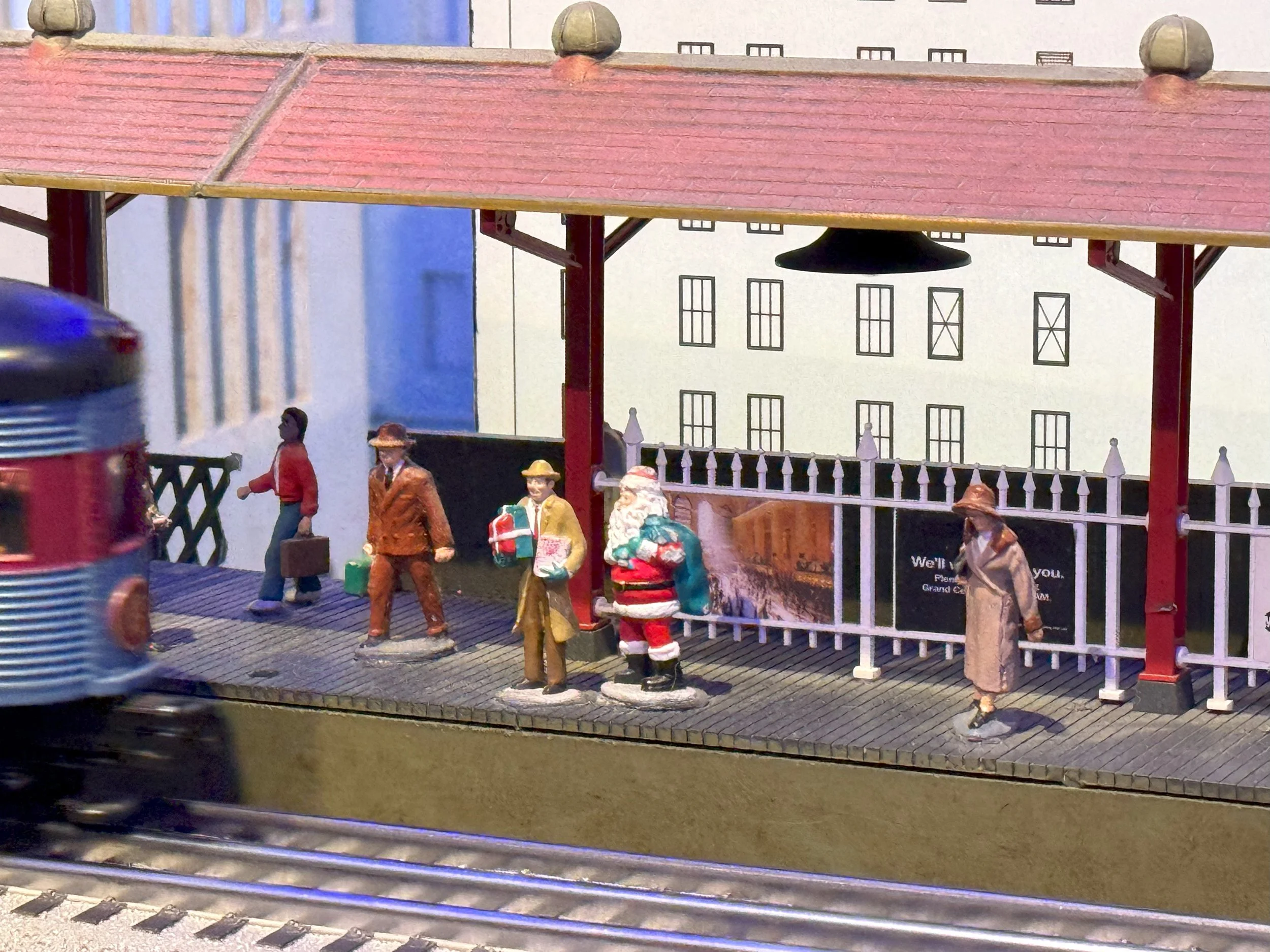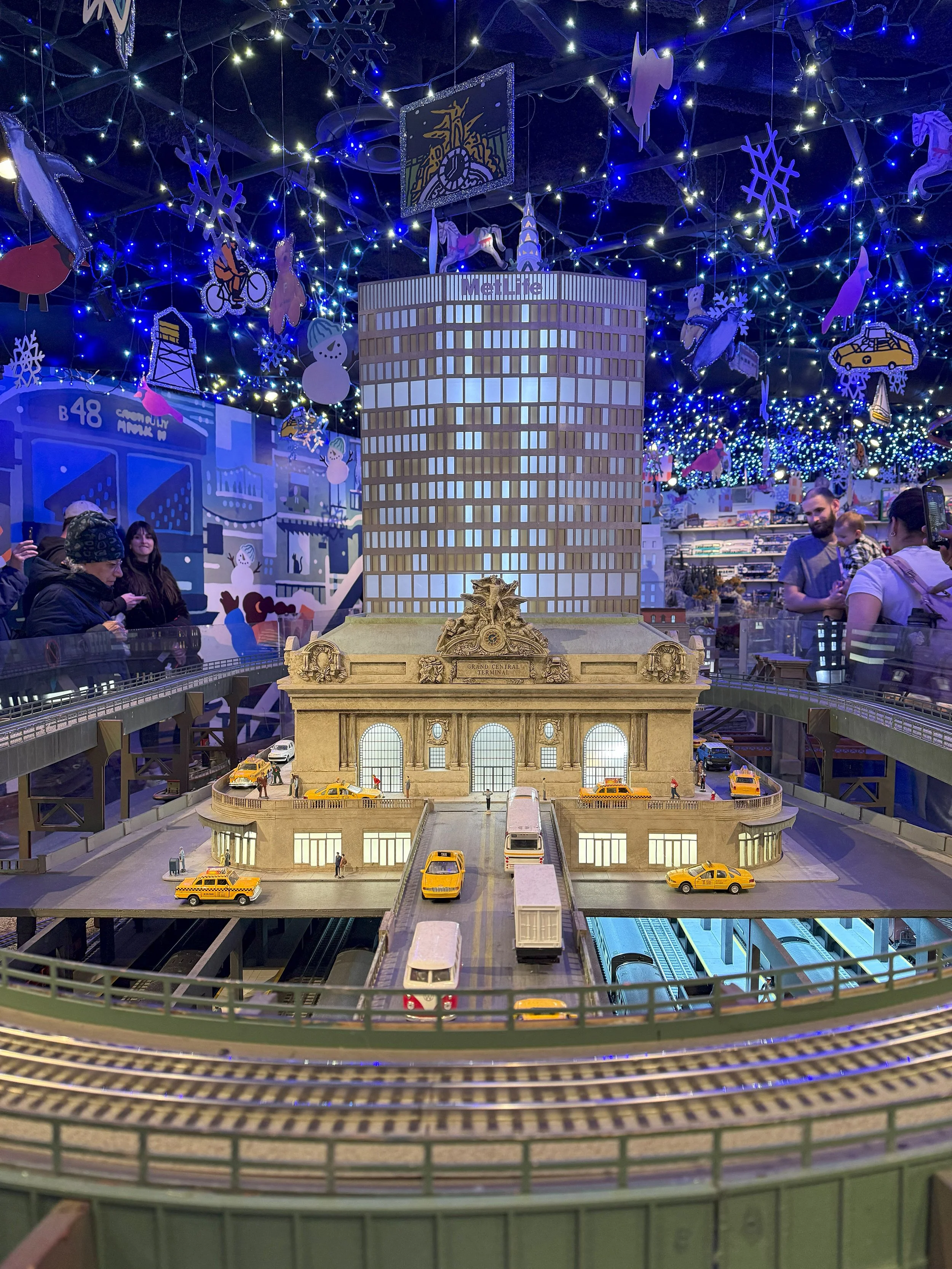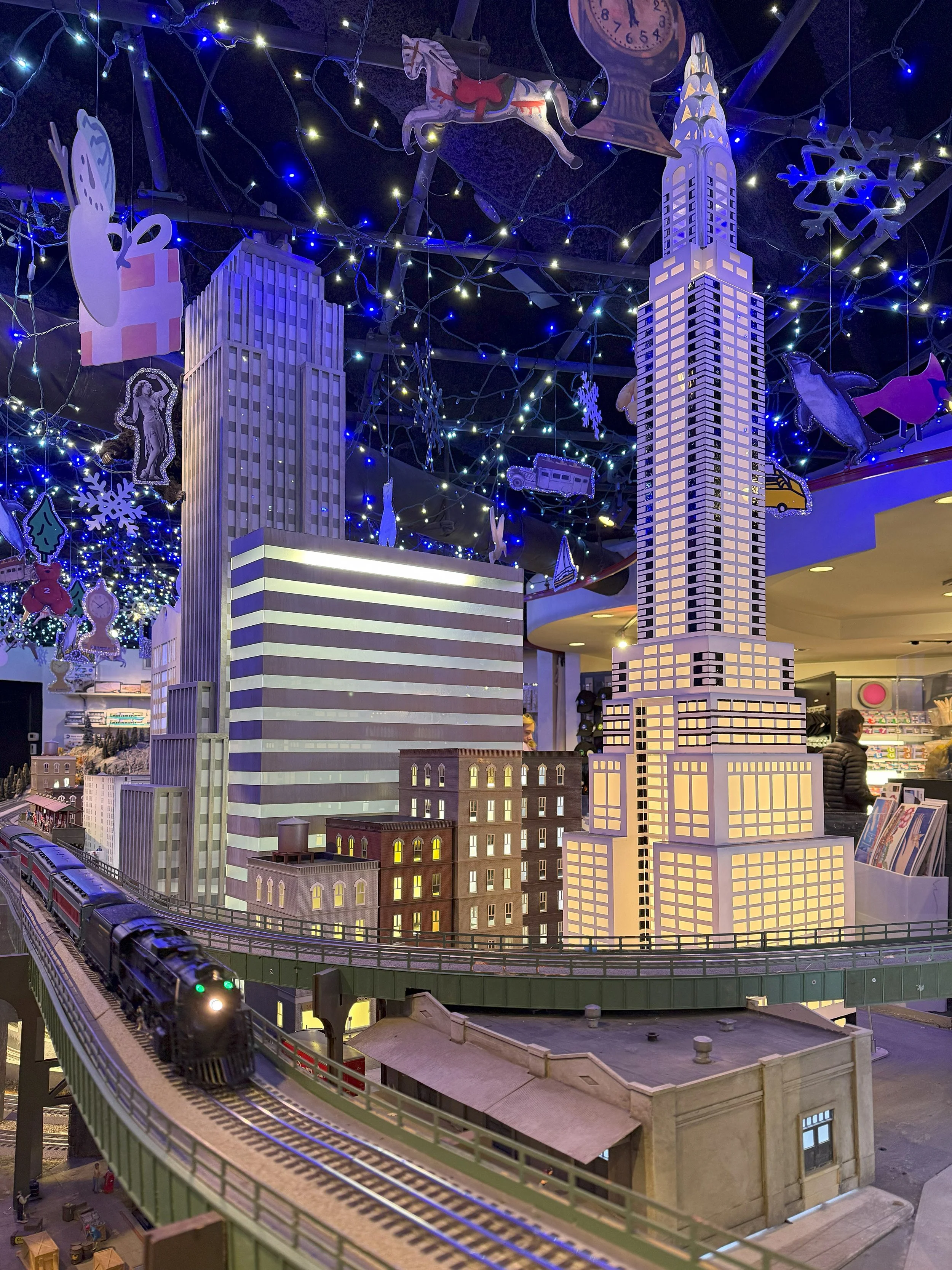 Our last stop on this first page of the slideshow is inside the Transit Museum inside Grand Central Terminal in New York, where we have a rare unobstructed view of their annual holiday train display. There are a lot of landmarks here but we’ll start with Grand Central itself, a representation of the very building that we’re standing in that, if truly accurate, would also contain an even smaller model of Grand Central inside it. I would normally not expect such accuracy in a model, but then I see what they did for CBGBs. When it was still open, I used to say that CBGBs lived on whatever level of hell had no fire codes (if you know me personally, chances are you heard me say that at some point), and this little tiny CBGBs lives up to that with the placement of a possible dead guy out front. And while I can not claim to have ever seen an actual dead guy lying in front of CBGBs, it is definitely on brand for that part of the Bowery when CBGBs was still there. Bravo Transit Museum Model Train Makers, Bravo.